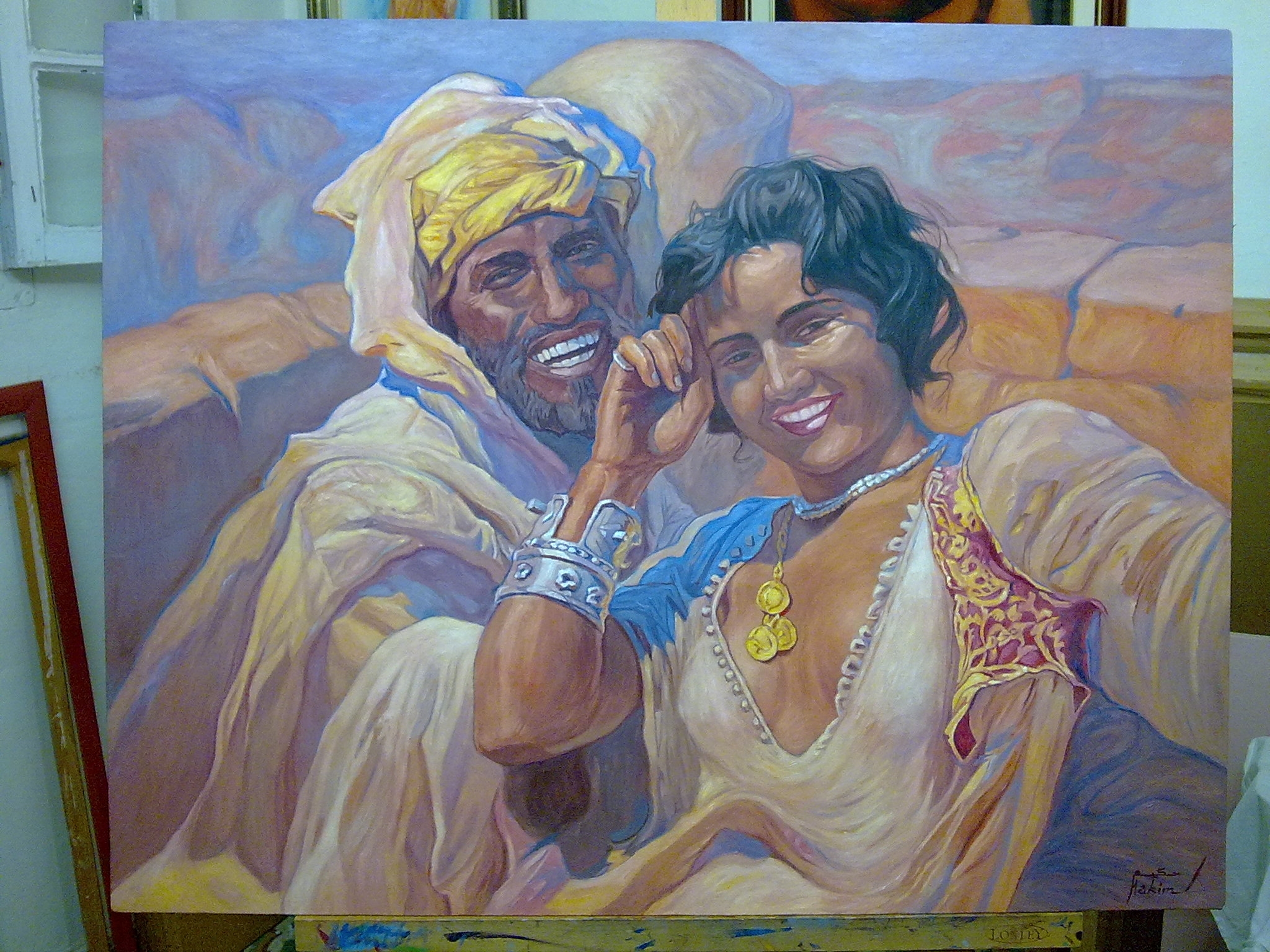Hakim el Harrak es un joven pintor nacido en Larache. Estudió en el Instituto Nacional de Bellas Artes de Tetuán, y posteriormente realizó cursillos de Grabado en Asilah. Autodidacta, su obra se caracteriza por trazos graves y subrayados, luminosos, con un uso del color en el que se aprecia la huella y el influjo de un cierto aroma orientalista. Diríase que es el trabajo de un artista europeo que trata de entrar en el universo idealizado del orientalismo africanista. Sin embargo, estamos ante un artista larachí que hurtando esa herencia (influencias de Bertuchi y otros pintores españoles y franceses) la mezcla curiosamente con esa manera tan propia de los artistas marroquíes de utilizar la luz como fogonazo y los colores brillantes del paisaje propio.