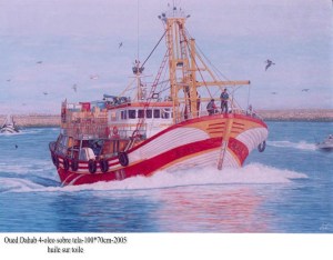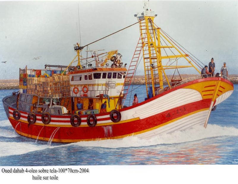 Y también el marsa de Larache, sus barcos de pesca, la entrada y la salida del río Lukus, a los que imprime, de la misma manera, una textura viva y colorista.