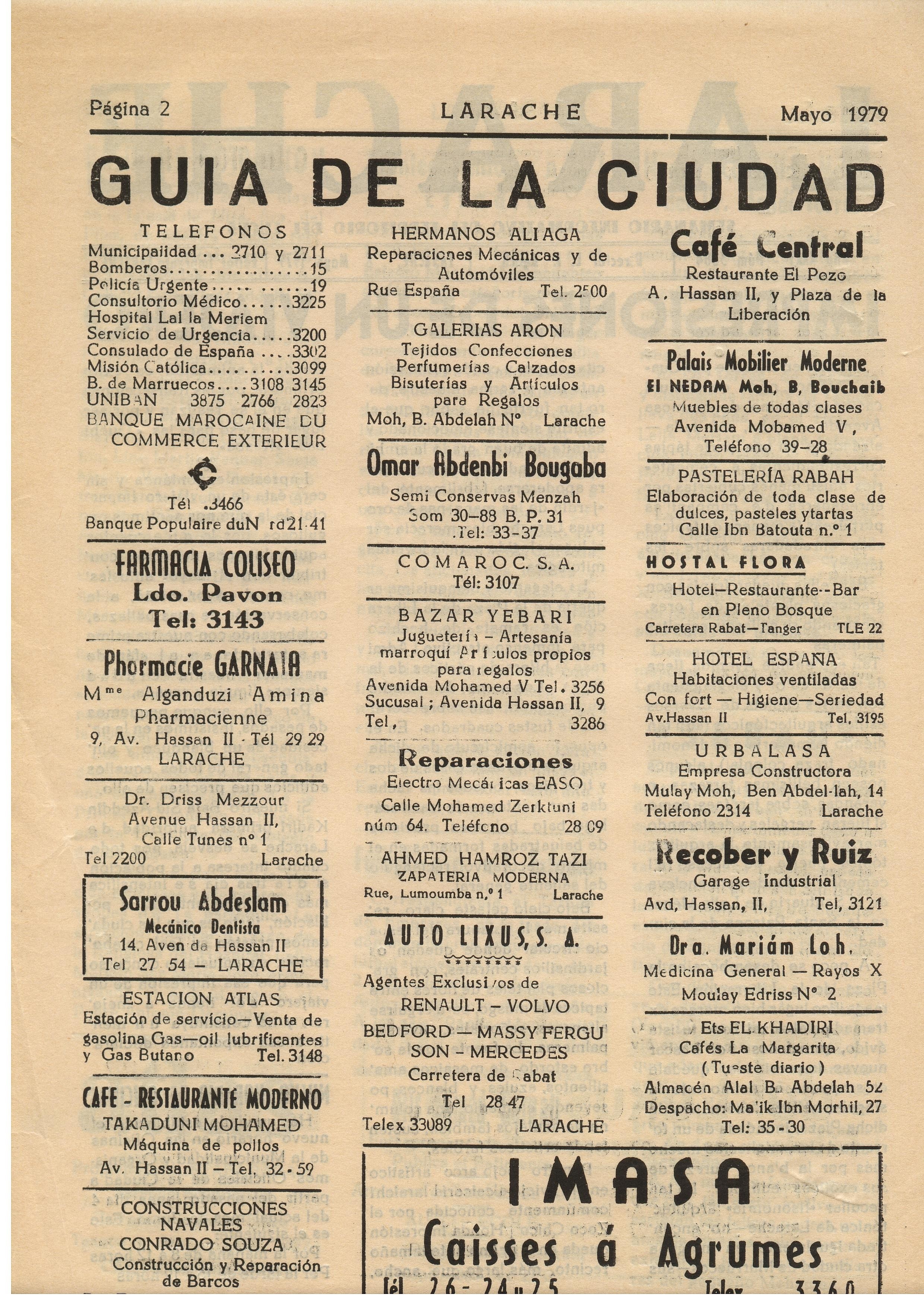 Una pequeña joya de museo esta página de la GUIA DE LA CIUDAD del diario de LARACHE de mayo del 79. Qué lejos queda todo… muchos de nosotros habíamos cruzado el estrecho hacía ya años para vivir en la península o muchos también fuera de ella… Eran nuestros años jóvenes cuando aún no nos dábamos realmente cuenta de cuánto habíamos dejado atrás.
