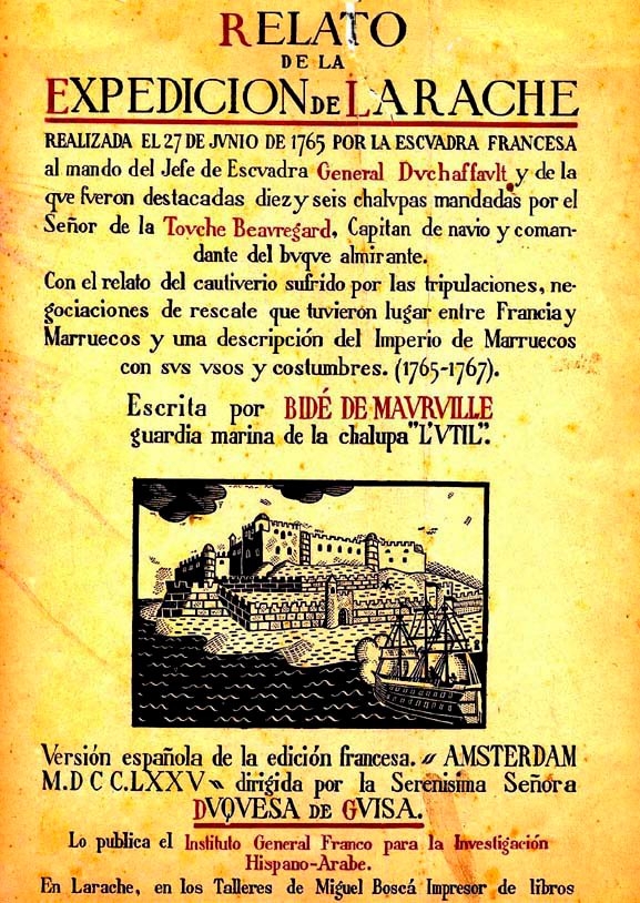 El fragmento está tomado de Larache a través de los textos <Junta de Andalucía, 2004> de María Dolores López Enamorado, que reproducía el texto de Relato de la Expedición de Larache, 1765, de Bidé de Maurville, traducción de la edición francesa original, Ámsterdam, 1765, y que se editó en Tánger, Publicaciones del Instituto General Franco, 1940, dirigida dicha publicación por la Duquesa de Guisa.