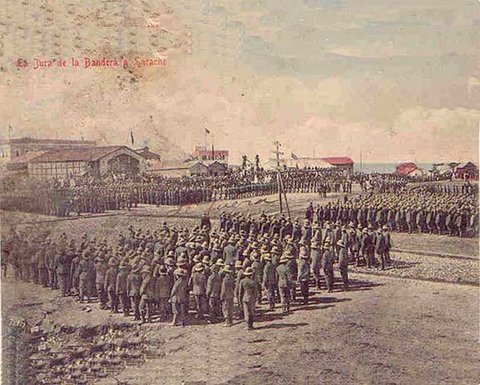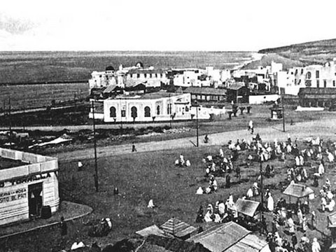 Negros de los confines del desierto, portadores de productos exóticos que intercambian recelosos y astutos por otros que les facilitan los desaprensivos chamarileros que el afán de lucro aleja de los suburbios de nuestras urbes del litoral andaluz. Mercaderes hebreos que se deslizan con femenil timidez entre los grupos de traficantes moros y cristianos para proponerles negocios seguros y lucrativos que ellos intervendrán sin riesgos. Ir y venir de jefes, oficiales y soldados de todas las armas y cuerpos por carreteras, plazas, calles y callejones. En derredor, la esbelta silueta de la torre arabesca de la Comandancia General; la perspectiva grata de algunas edificaciones modernas; hacia el mar, el pequeño faro del desmantelado espigón que semeja un gigante hueso de oliva; un vapor embarrancado que las olas y los hombres van desguazando, y en la lejanía el <Isla de Menorca> que al sonar su sirena parece entonar un canto a la Diosa Terpsícore.