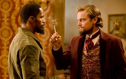 Quentin Tarantino es un embaucador, pero tan inteligente que arma sus películas como perfectos engranajes. Escribe un guión excelente y dirige con mano maestra. No oculta nada en esta película: coge uno de los títulos míticos del spaghetti-western “Django” (1966) de Sergio Corbucci y que protagonizara Franco Nero, en la que se narraban las peripecias de un pistolero que llega a un pueblo cochambroso del Oeste arrastrando un ataúd, pero, por supuesto, no rueda esa película, solo toma el nombre del protagonista: “Django: d-j-a-n-g-o, la d es muda” dice Jamie Foxx en una hermosa imagen de homenaje cien por cien tarantiniana, y le replica un Franco Nero ya con bastantes años a sus espaldas: “Lo sé”. Así que toma el nombre del protagonista y homenajea a Franco Nero, el primer Django, y además de esto coge el tema principal de apertura de aquella película y sin más la coloca como música de cabecera de los títulos de crédito de la suya, sin complejo alguno, y suena como si fuera la primera vez que la escuchásemos. Magnífica canción la del excelente músico Luis Bakalov. Le queda genial esta idea. Y suena así: