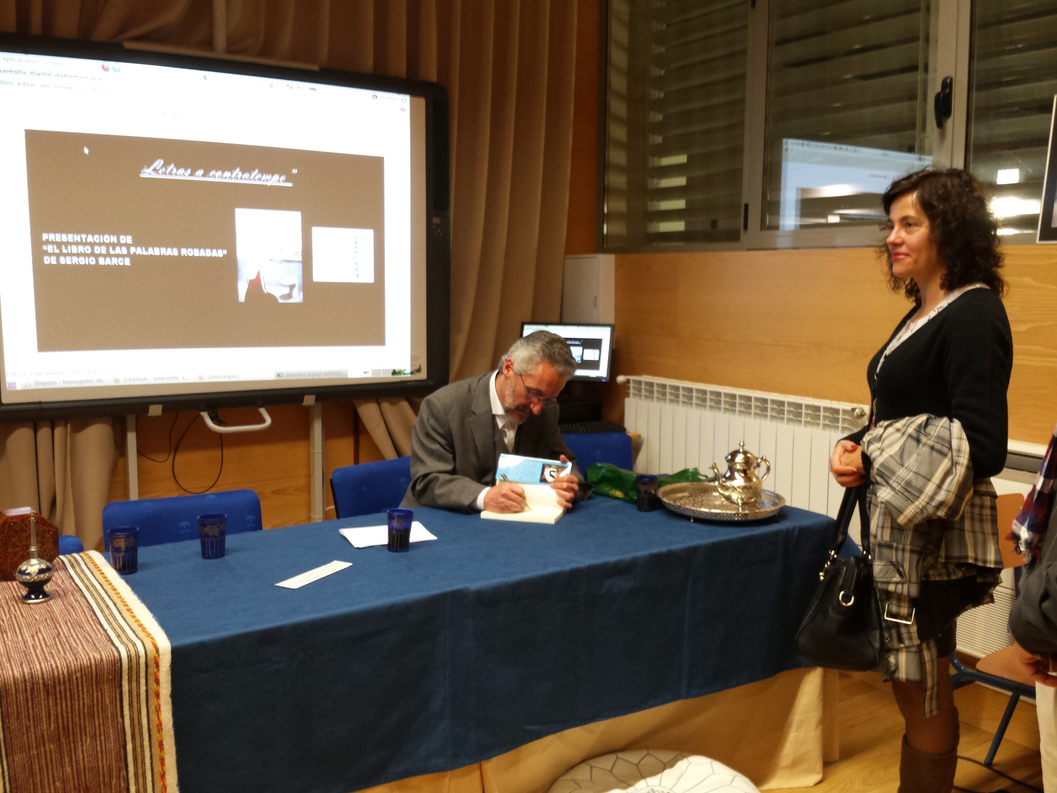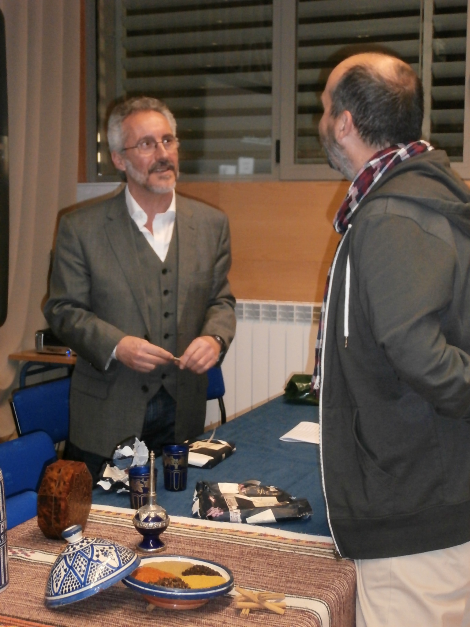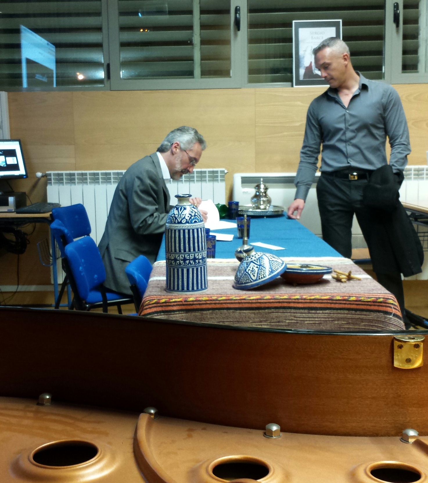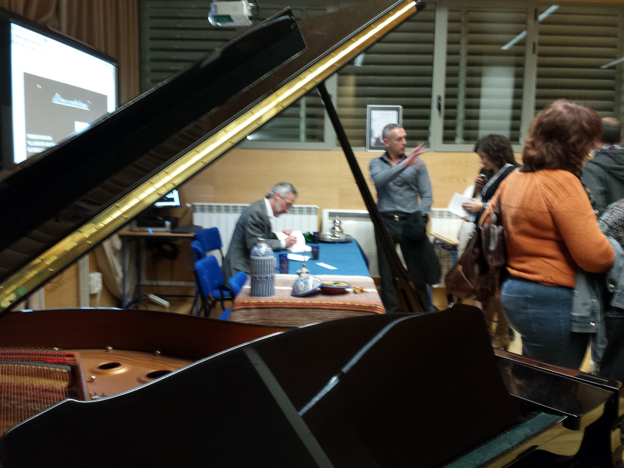 Su director, Ernesto Blanco, y su equipo habían preparado todo con tanto esmero que me sentí inmediatamente arropado. En la sala donde iba a tener lugar el acto, el Aula de Coro, habían colgado, en cuadros perfectamente montados, todas las portadas de mis libros, y, además, las de las publicaciones en las que he participado con relatos o colaboraciones de algún tipo. Además de eso, Ernesto se había cuidado muy mucho de poner unas pinceladas de color a nuestro alrededor, decorando el entorno con motivos marroquíes. E incluso nos sirvió té verde con yerbabuena con la típica tetera plateada en los tradicionales vasos.