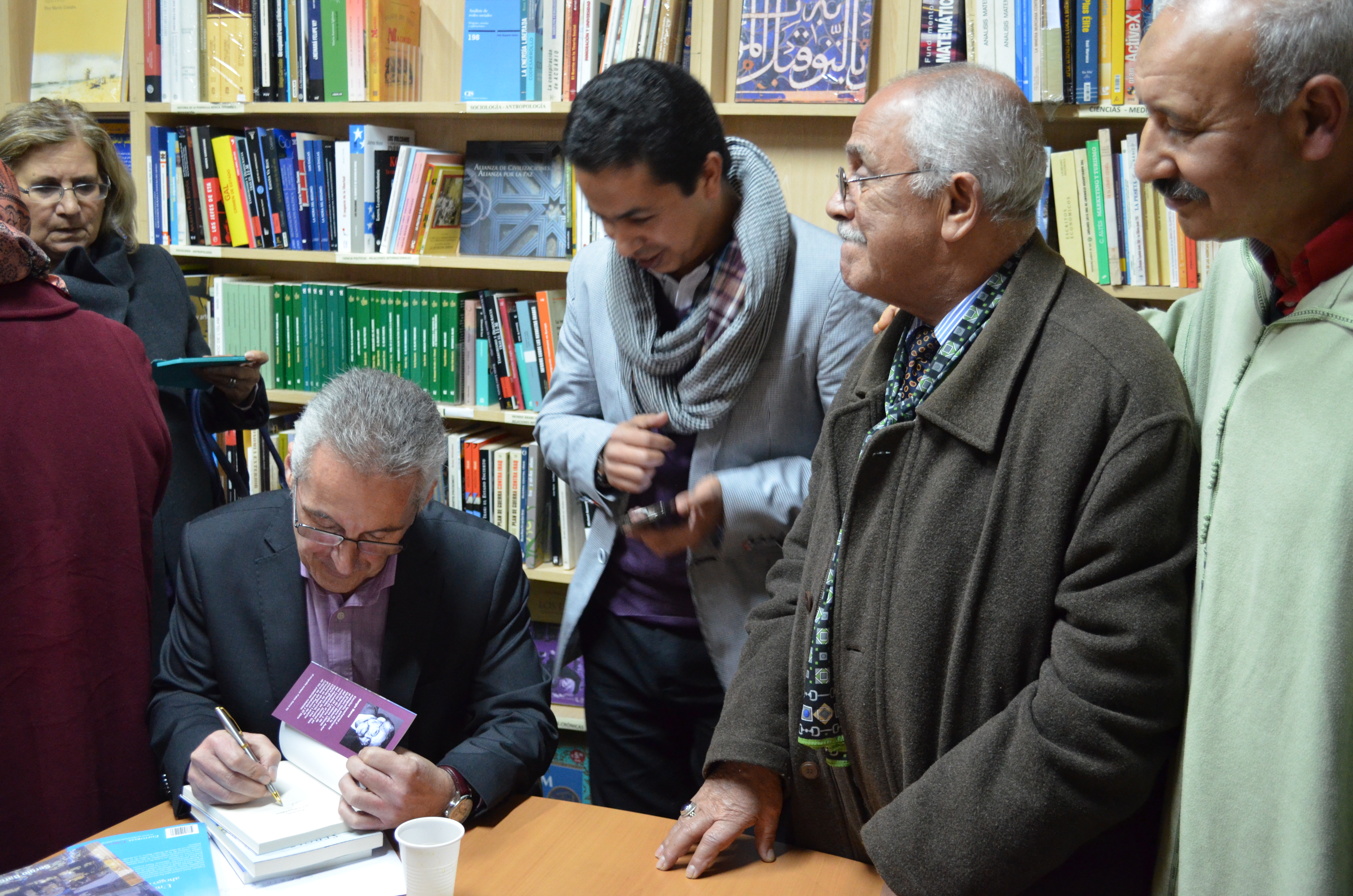 Firmando ejemplares para Aziz Bouhdoud, junto a Mohamed Mrabet y Abdeslam Boubel