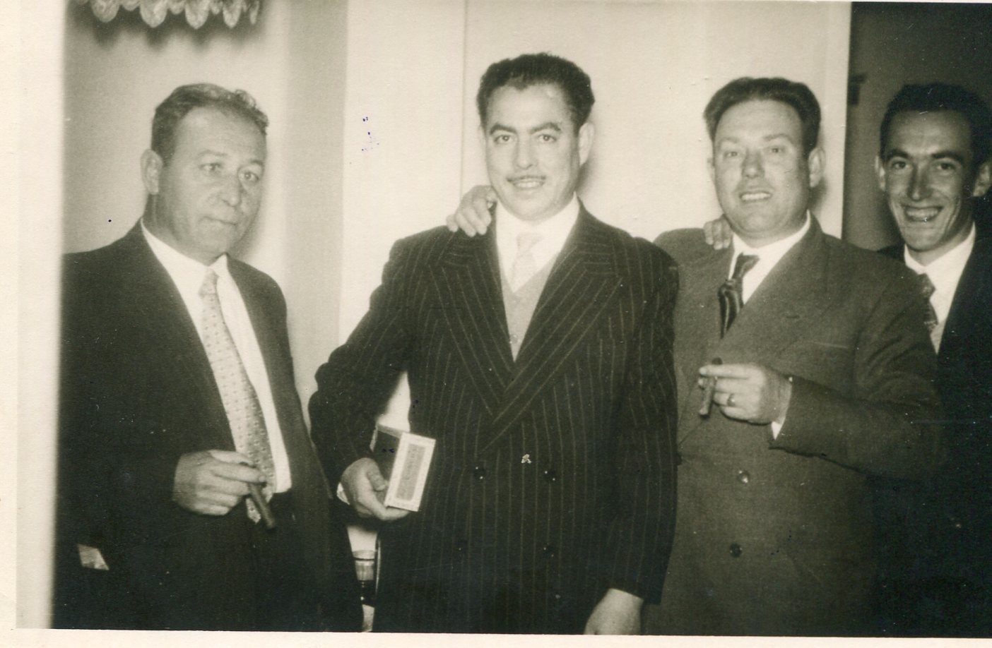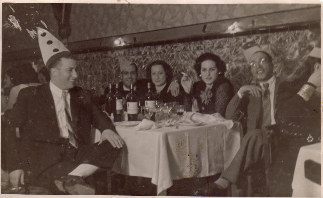 fin de año 1948 – Larache – Casino Judío. Por la izquierda, Abraham Amselem, su cuñado con Plata su mujer, Simha Amselem e Isaac Barcessat Gabay