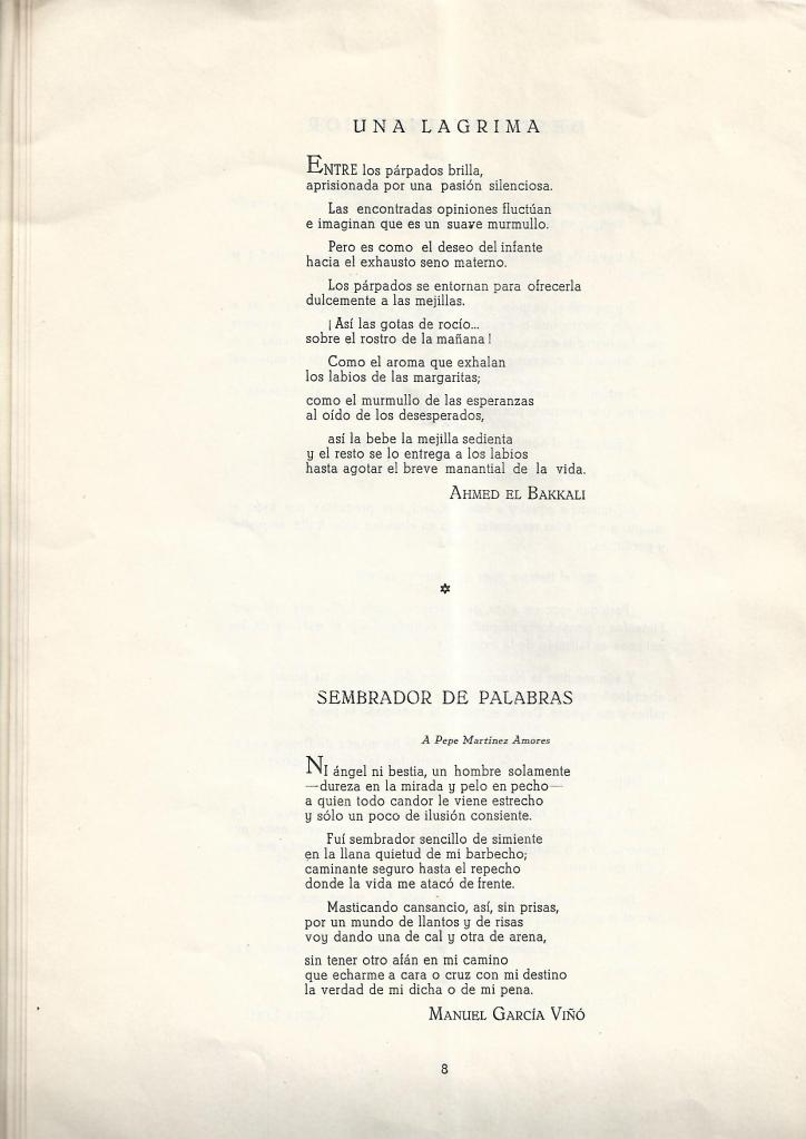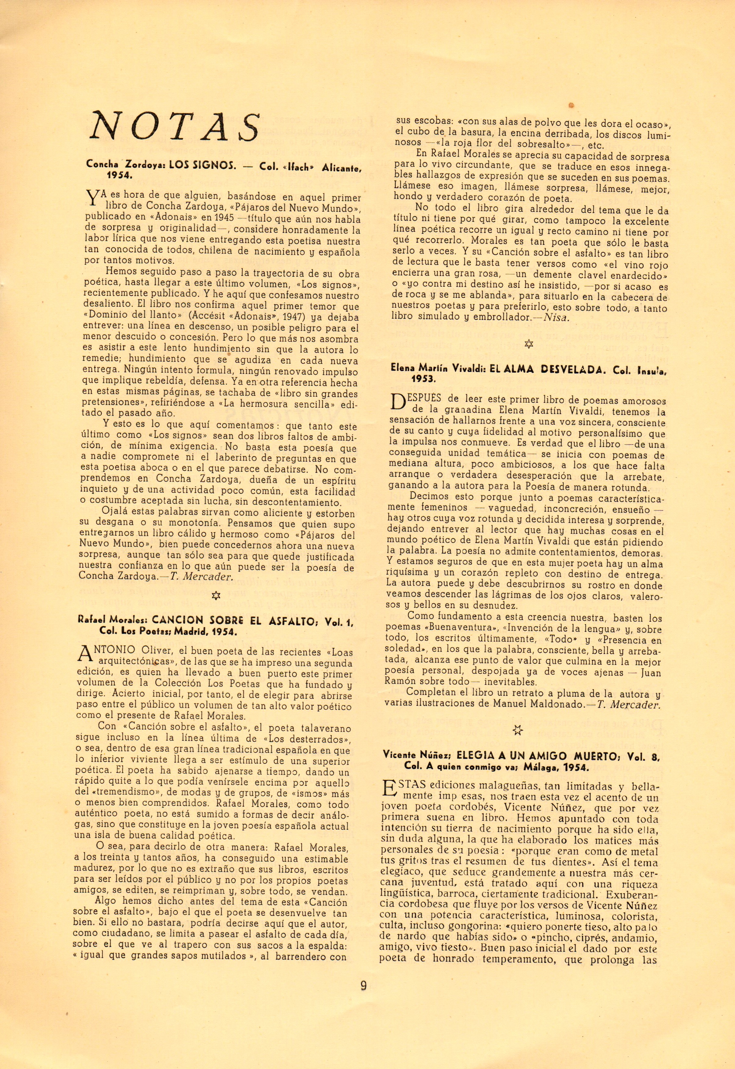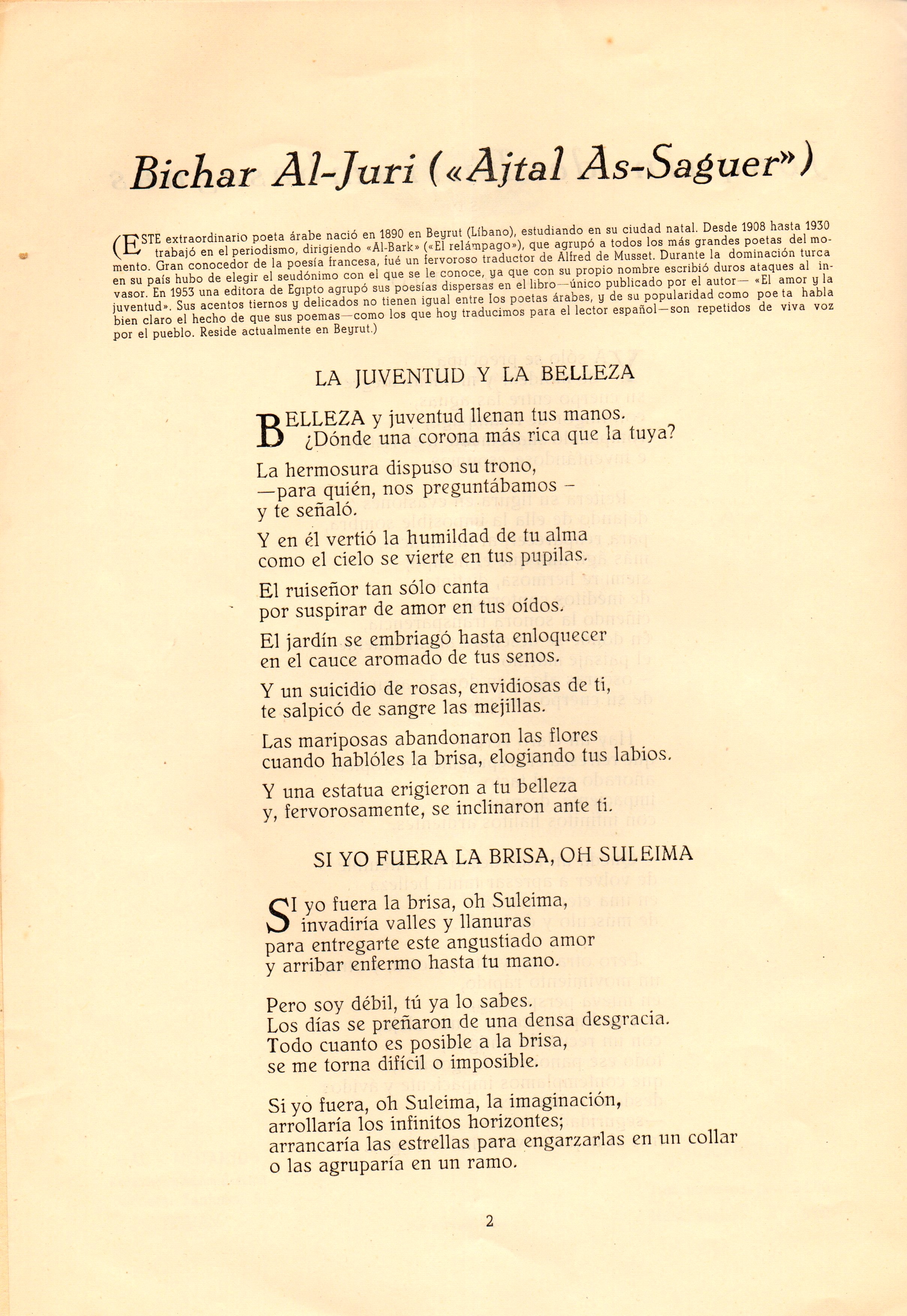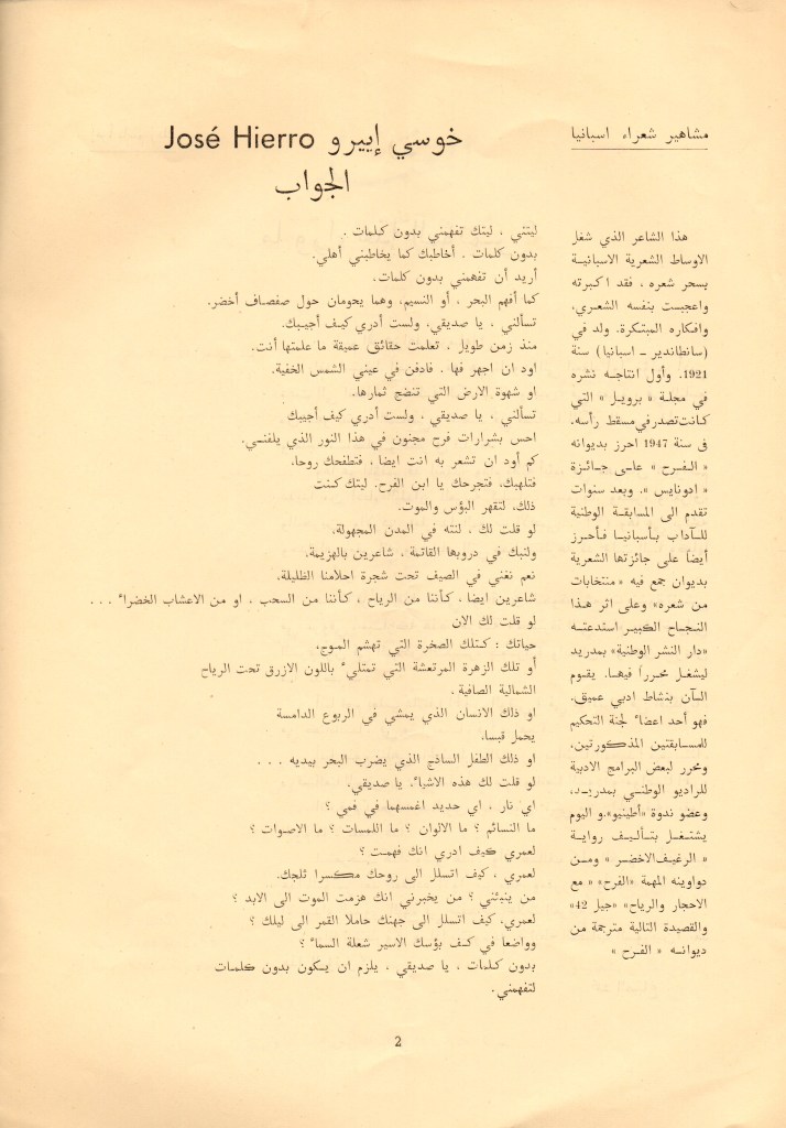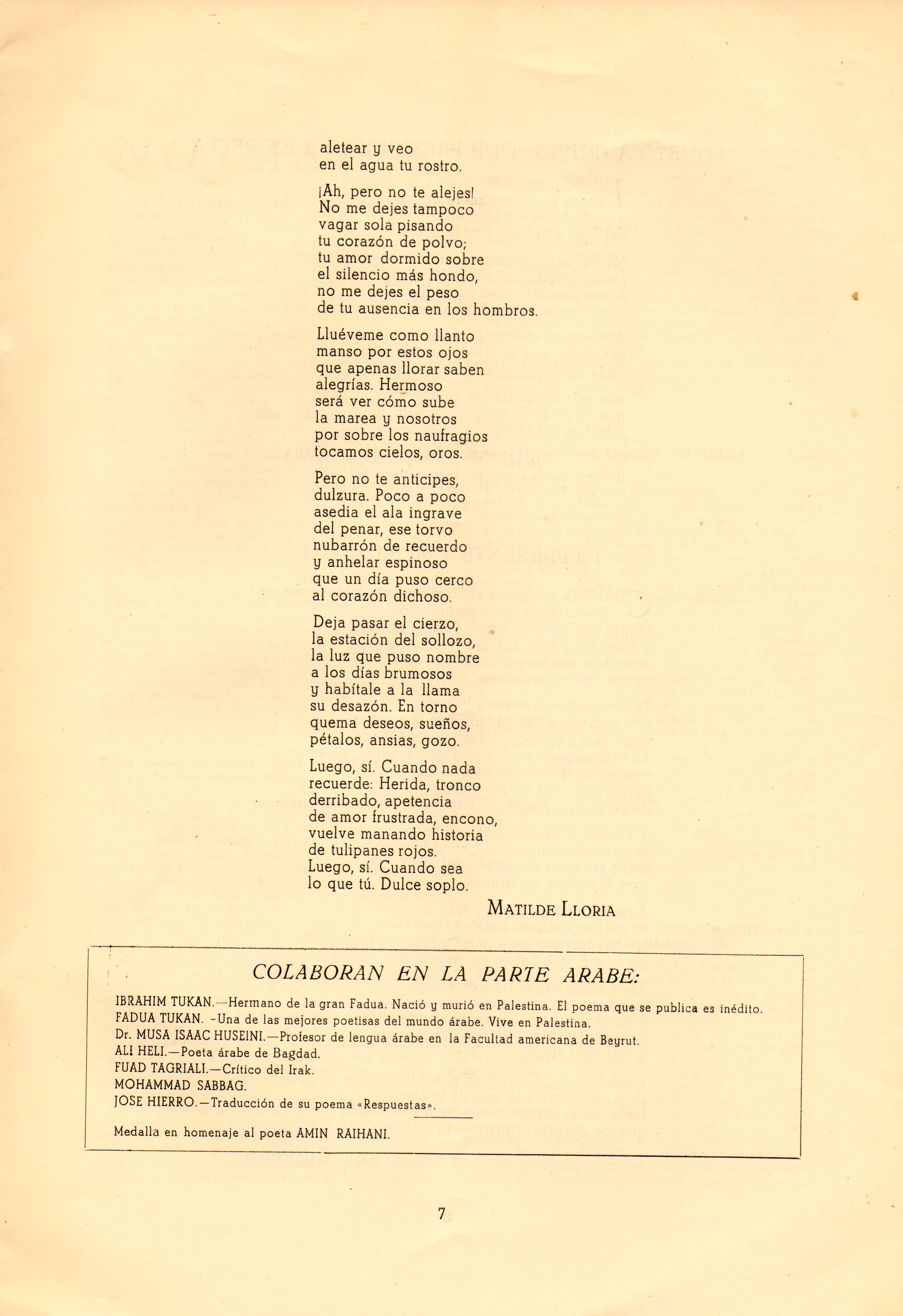 En este número, participan junto a Trina Mercader, los autores Joaquín de Entrambasaguas, Bichar Al-Juri, Vicente Aleixandre, Pilar Paz Pasamar, Luis López Anglada, Matilde Lloria, J. Gerardo Manrique de Lara, José Guerrero y Pío Gómez Nisa. Y en árabe: Ibrahim Tukan, Fadua Tukan, Dr. Musa Isaak Huseini, Ali Heli y Mohammad Sabbag. Incluye la traducción al árabe del poema «Respuestas» de José Hierro.