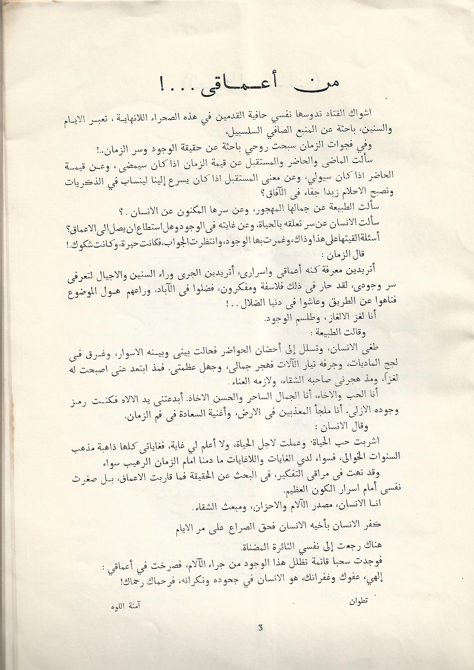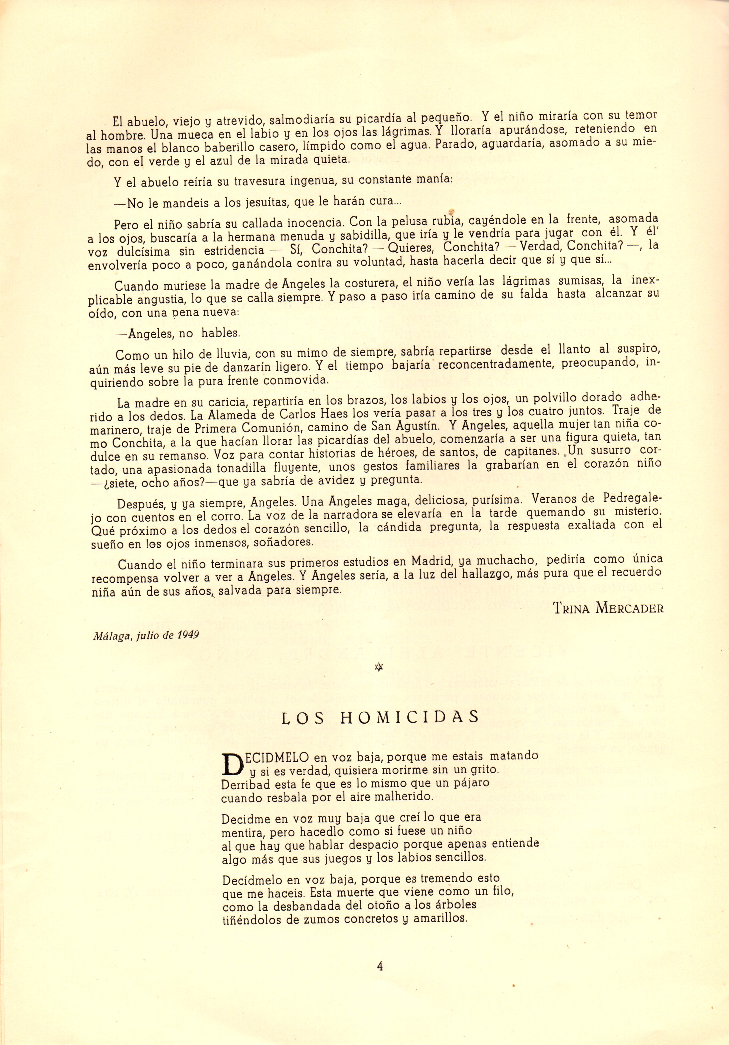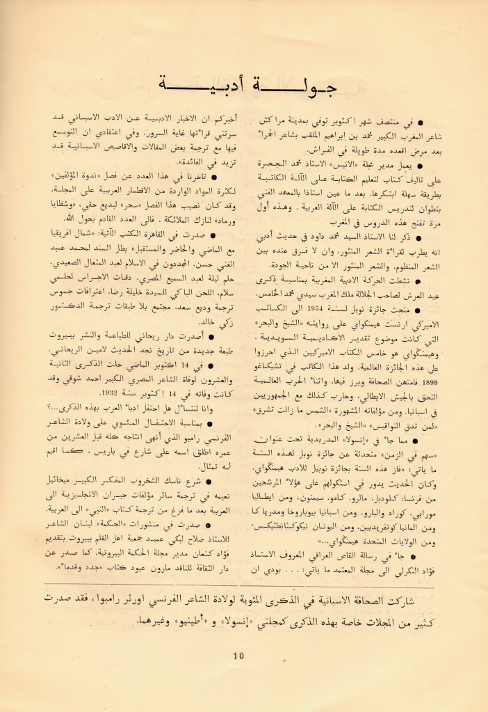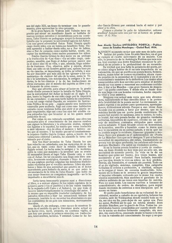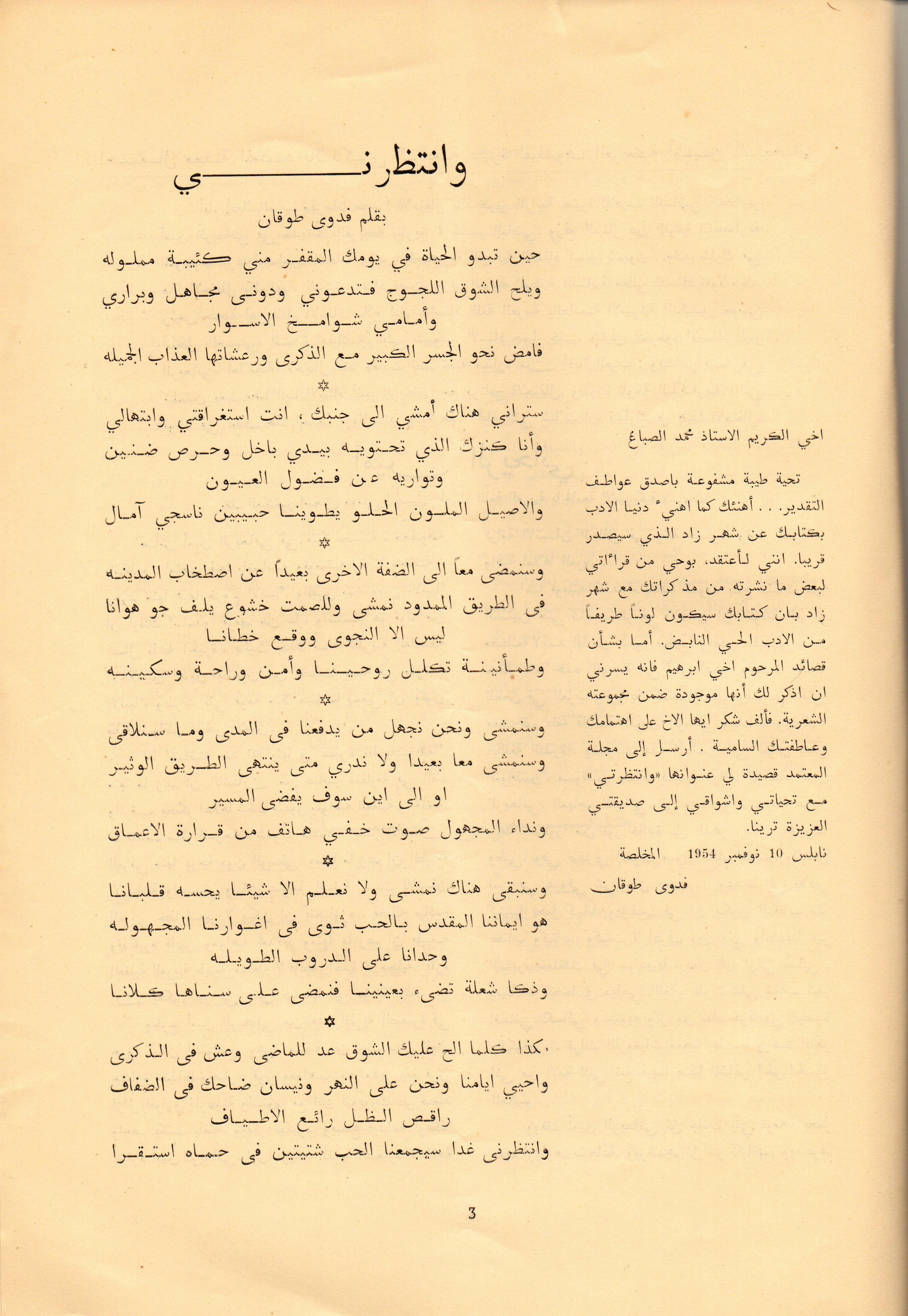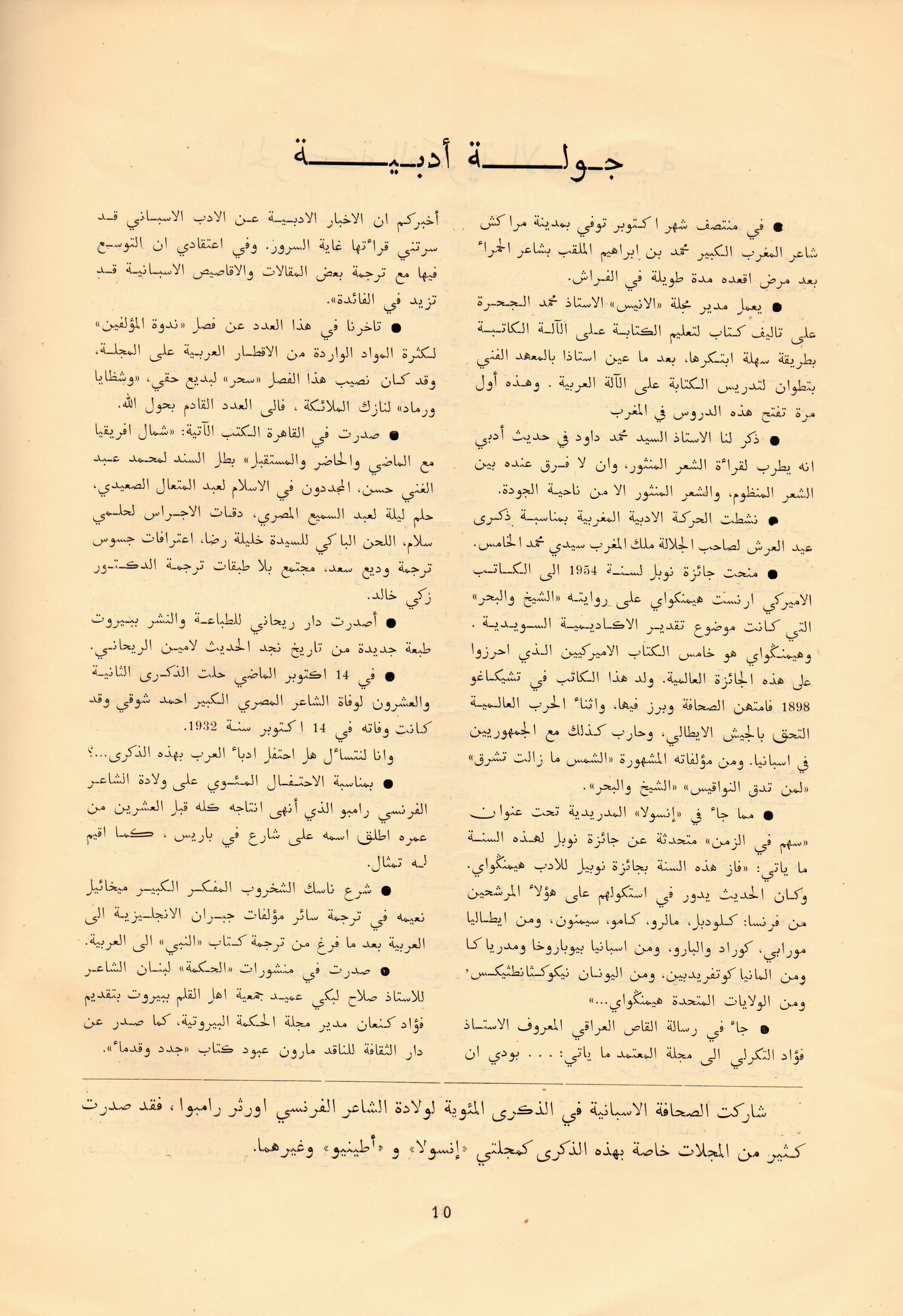En este número, participan junto a Trina Mercader, los autores Joaquín de Entrambasaguas, Bichar Al-Juri, Vicente Aleixandre, Pilar Paz Pasamar, Luis López Anglada, Matilde Lloria, J. Gerardo Manrique de Lara, José Guerrero y Pío Gómez Nisa. Y en árabe: Ibrahim Tukan, Fadua Tukan, Dr. Musa Isaak Huseini, Ali Heli y Mohammad Sabbag. Incluye la traducción al árabe del poema «Respuestas» de José Hierro.