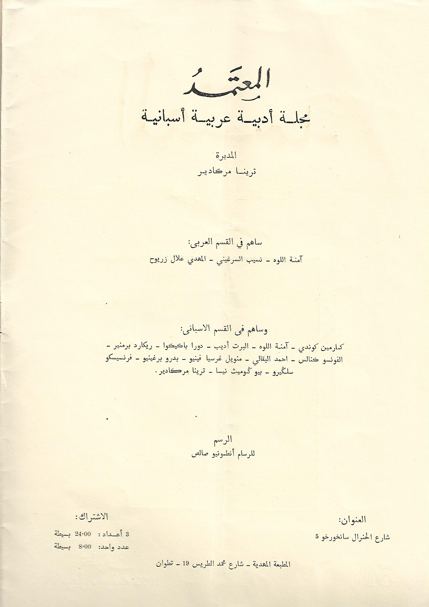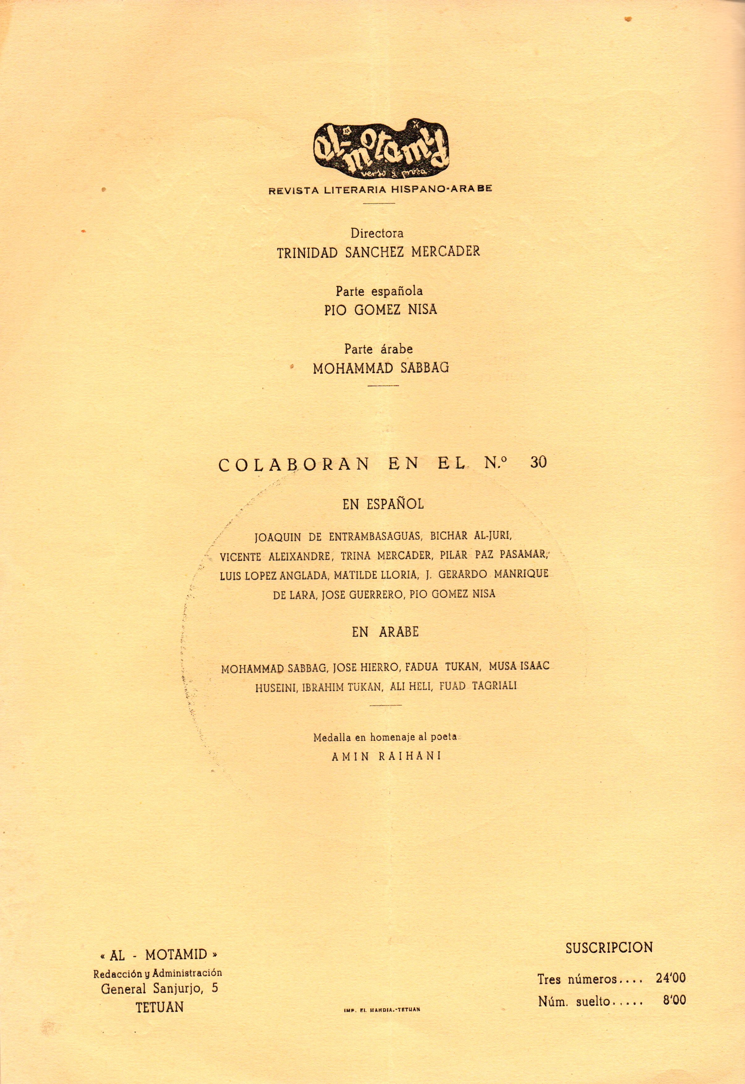 En este número, participan, junto a Trina Mercader, los autores Carmen Conde, Albert Adib, Dora Bacaicoa, Ricard Permanyer, Alfonso Canales, Amina Loh, Ahmed Bakkali, Manuel García Viño, Pedro Bargueño, Francisco Salgueiro y Pío Gómez Nisa. Y en árabe: Amina Loh, Nasib Sarguini y Mahdi Al-Lal Sarioh.