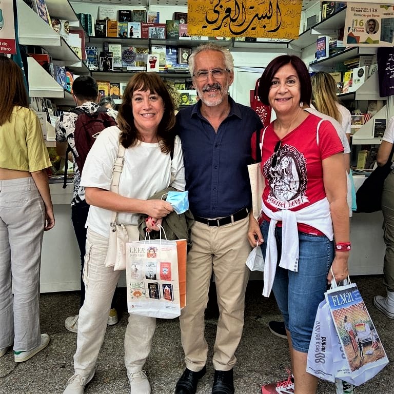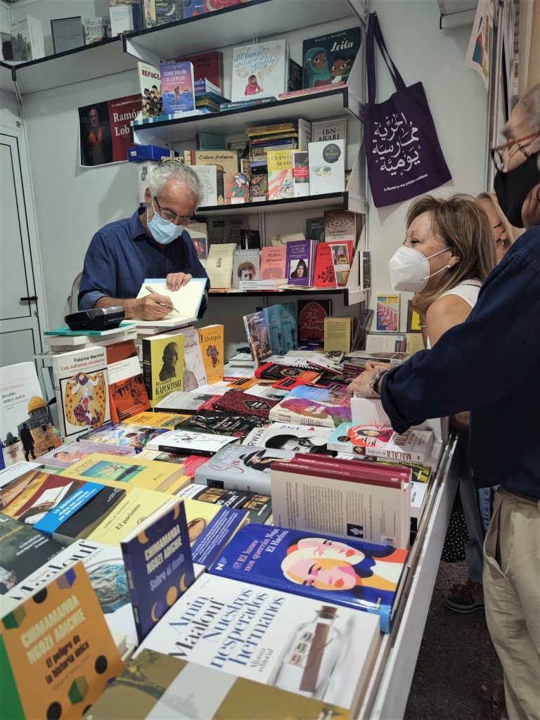 Farid Othman me visitó en la caseta, como Alberto. Pero otros amigos no pudieron acceder por las colas interminables para entrar en el recinto de la Feria, como el escritor Iñaki Martínez, lo que me resultó frustrante, tanto o más que a él. Ya fuera, me encontré con el también escritor Mohamed El Morabet, que, para celebrar nuestro reencuentro, me regaló un precioso volumen de Idilio, de Javier Montesol, dedicado a la obra de Mariano Fortuny en Tánger (y nos emplazamos para celebrar en poco tiempo una buena noticia que me adelantó a sotto voce). También mi amigo José Luis Fernández Lozano se quedó atrapado en las largas colas, pero lo compensamos y nos vimos fuera y logré dedicarle el libro.