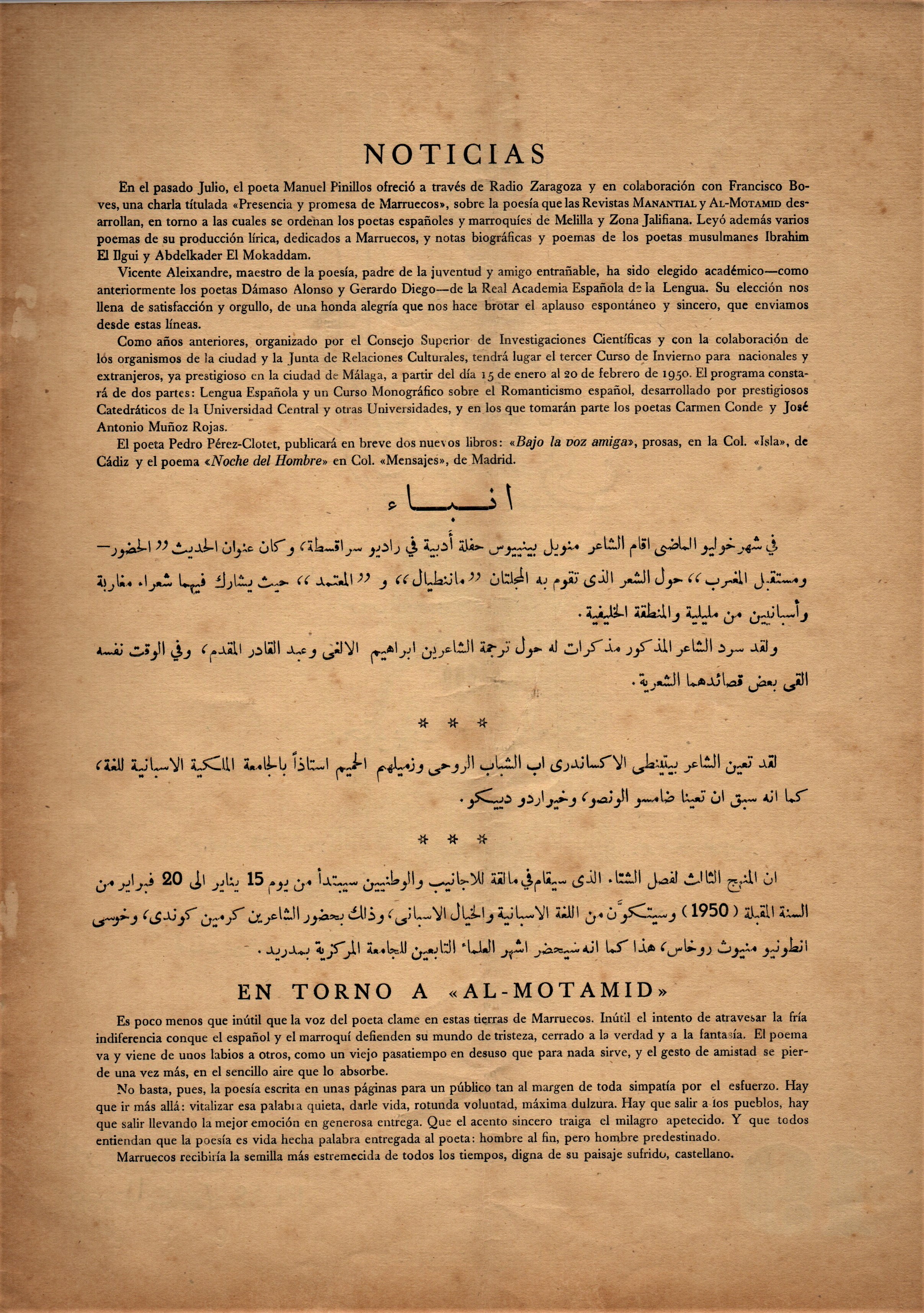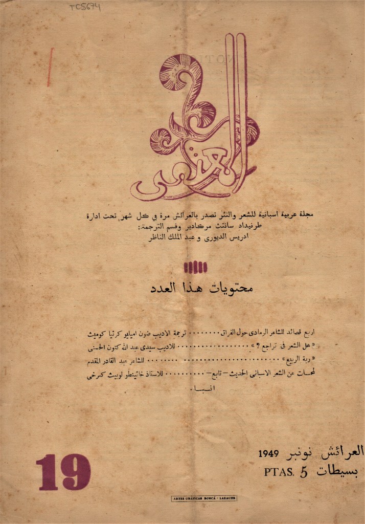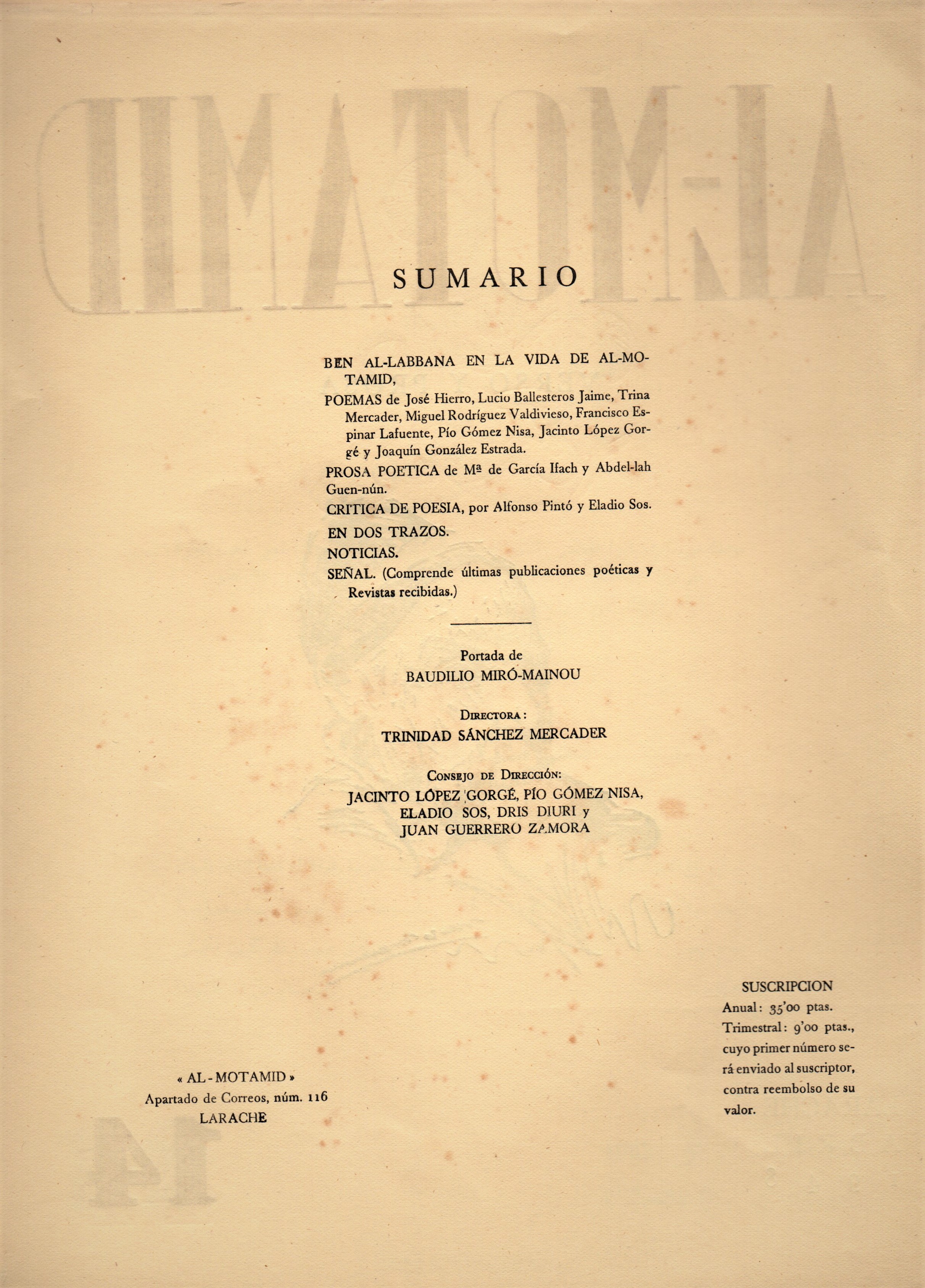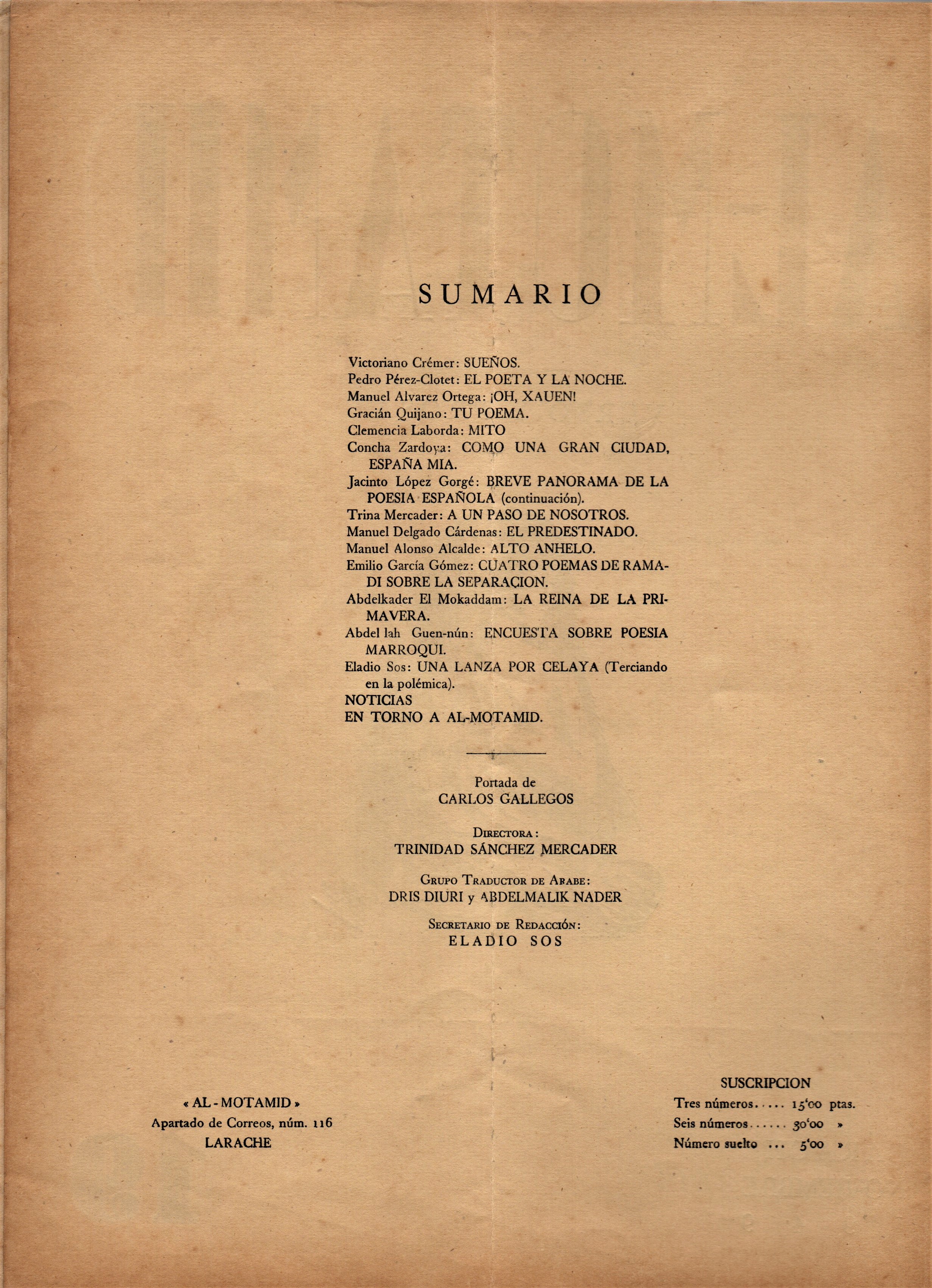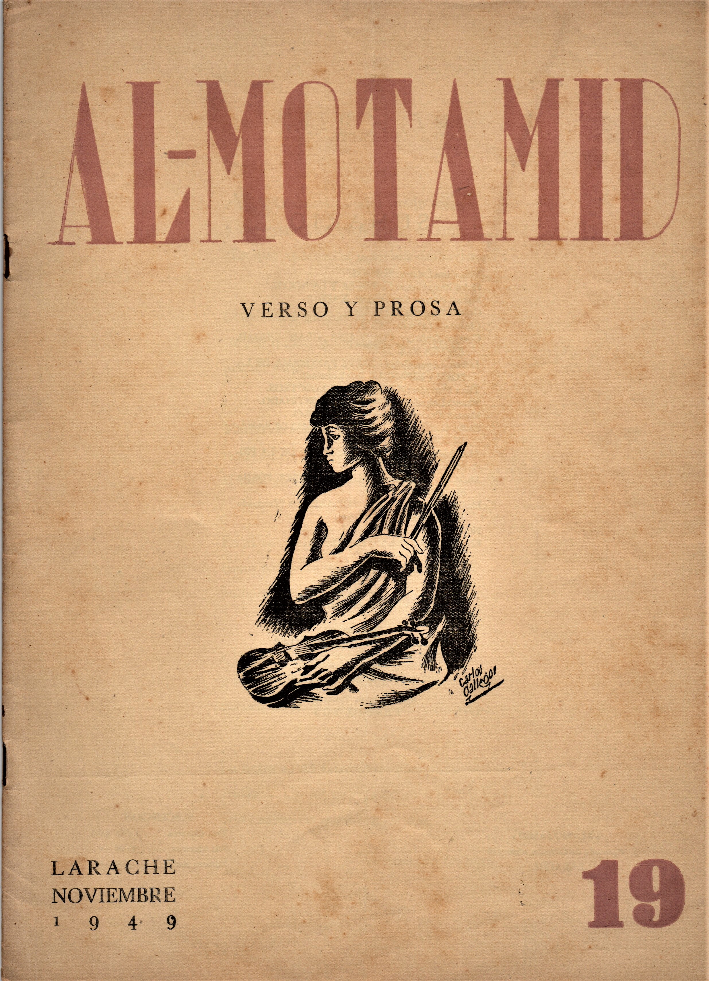 Con anterioridad he compartido con vosotros los números que conservo 11, 14, 17, 19 y 21, de la revista AL-MOTAMID (VERSO Y PROSA). Hoy comparto el número 22 completo. De nuevo, editada en Larache. Este número lo fue en septiembre de 1950, siendo directora la poeta Trina Mercader, secretario de redacción Eladio Sos y traductores de árabe Abdelmalik Nader y el poeta larachense Dris Diuri. La portada de este número es obra de Rosendo Guevara.
