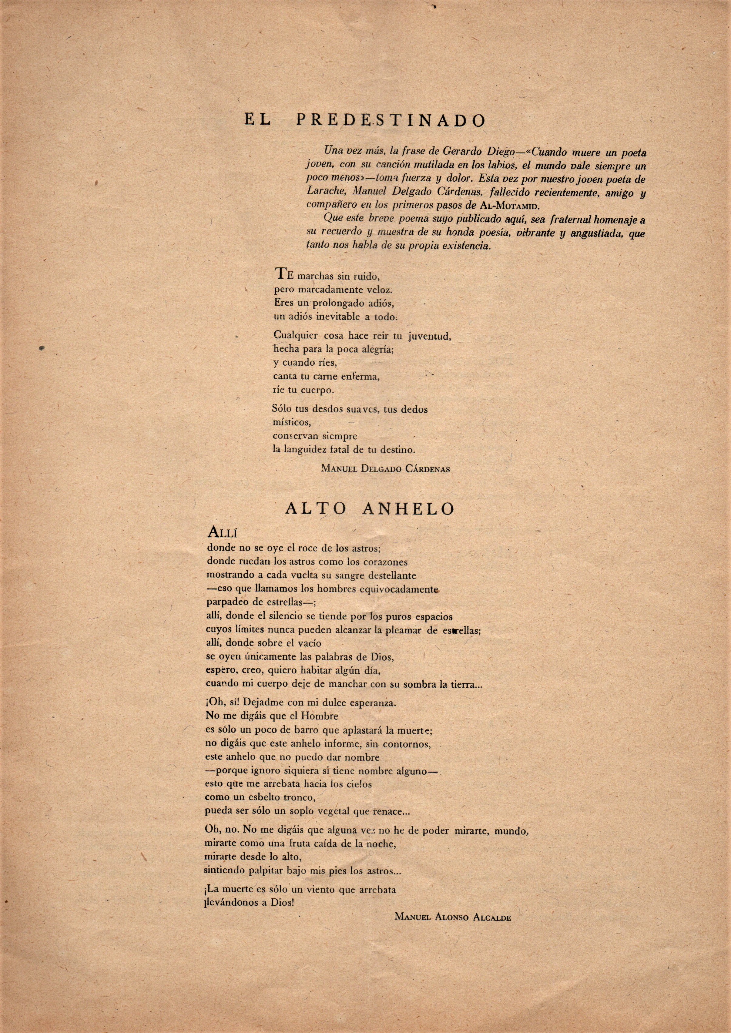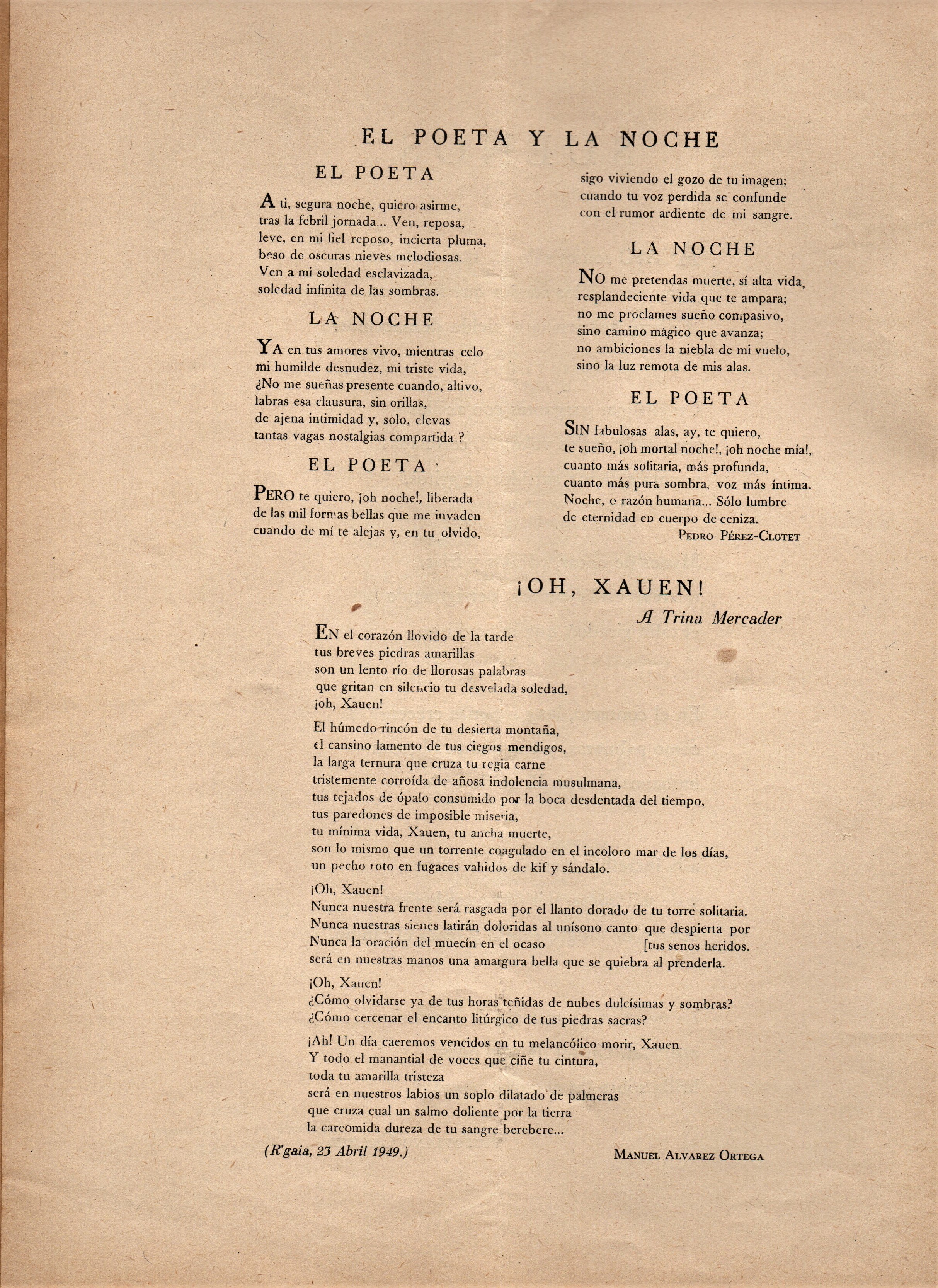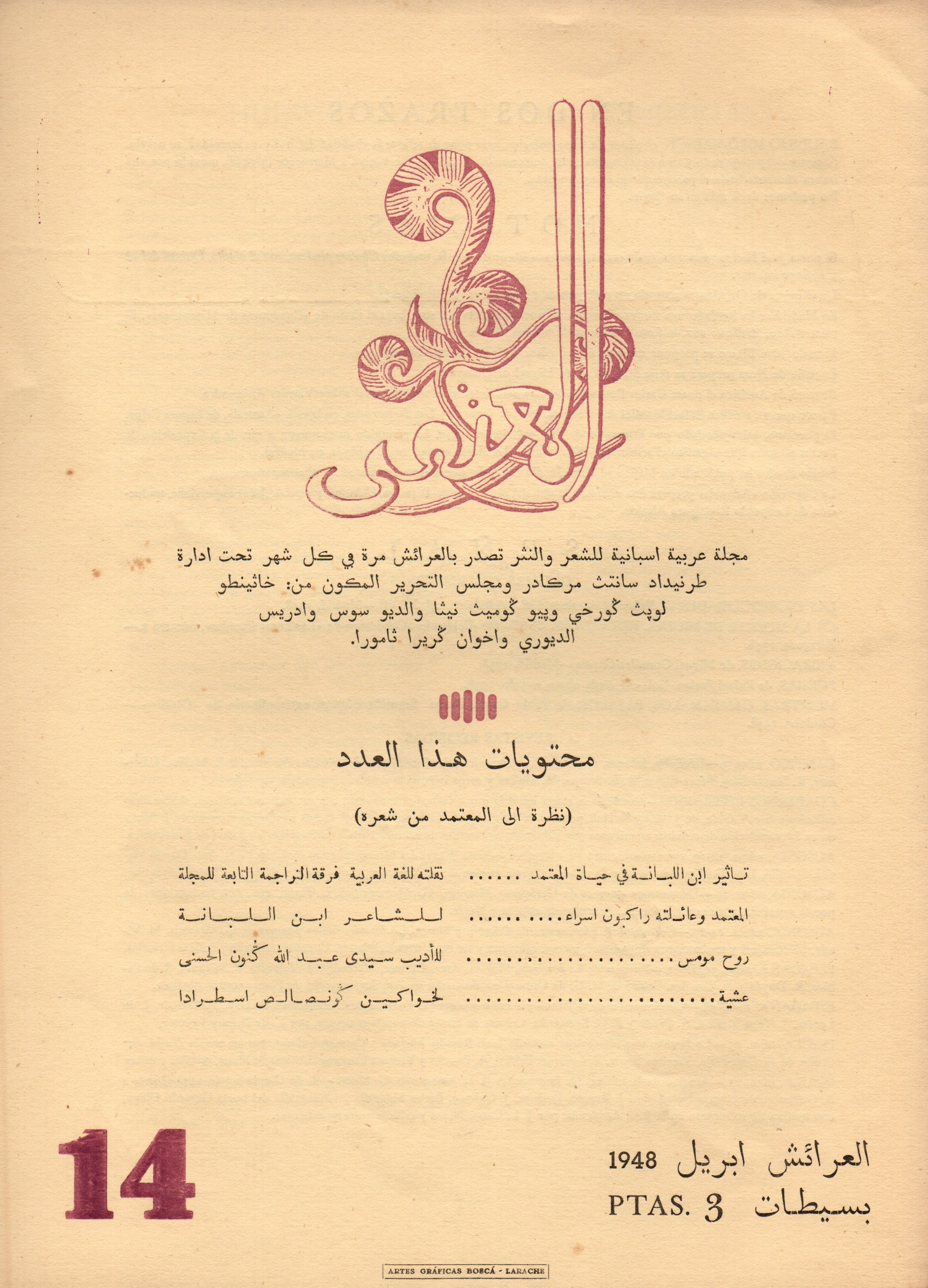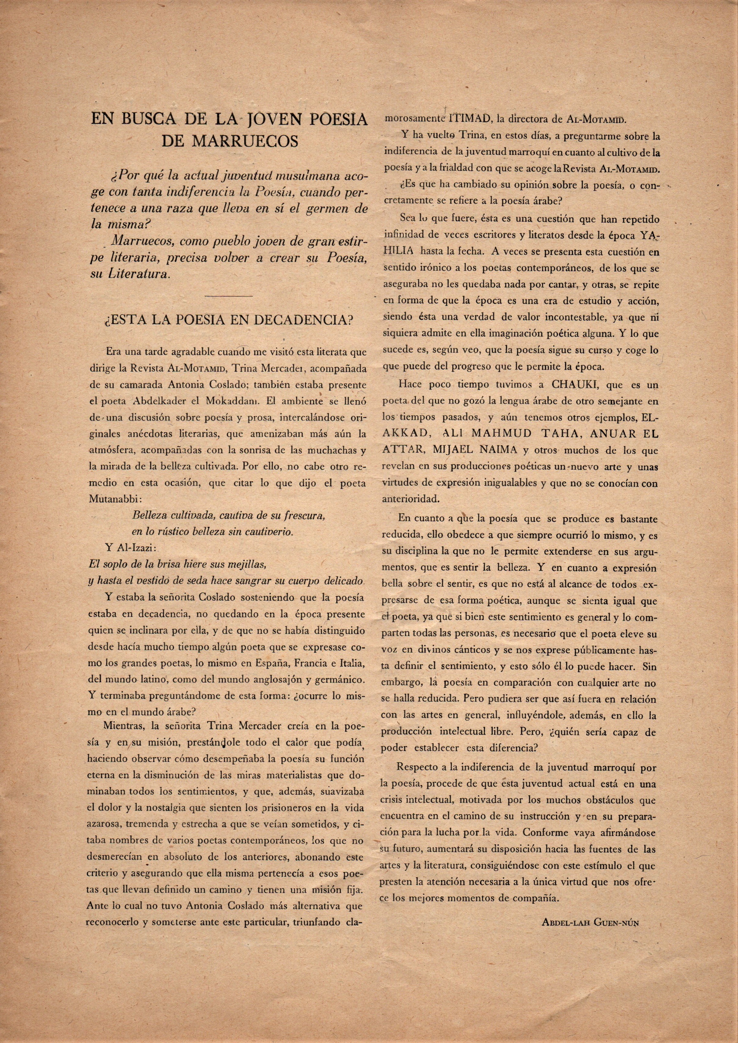 Con anterioridad he compartido con vosotros los números que conservo 11, 14, 17, 19 y 21, de la revista AL-MOTAMID (VERSO Y PROSA). Hoy comparto el número 22 completo. De nuevo, editada en Larache. Este número lo fue en septiembre de 1950, siendo directora la poeta Trina Mercader, secretario de redacción Eladio Sos y traductores de árabe Abdelmalik Nader y el poeta larachense Dris Diuri. La portada de este número es obra de Rosendo Guevara.
