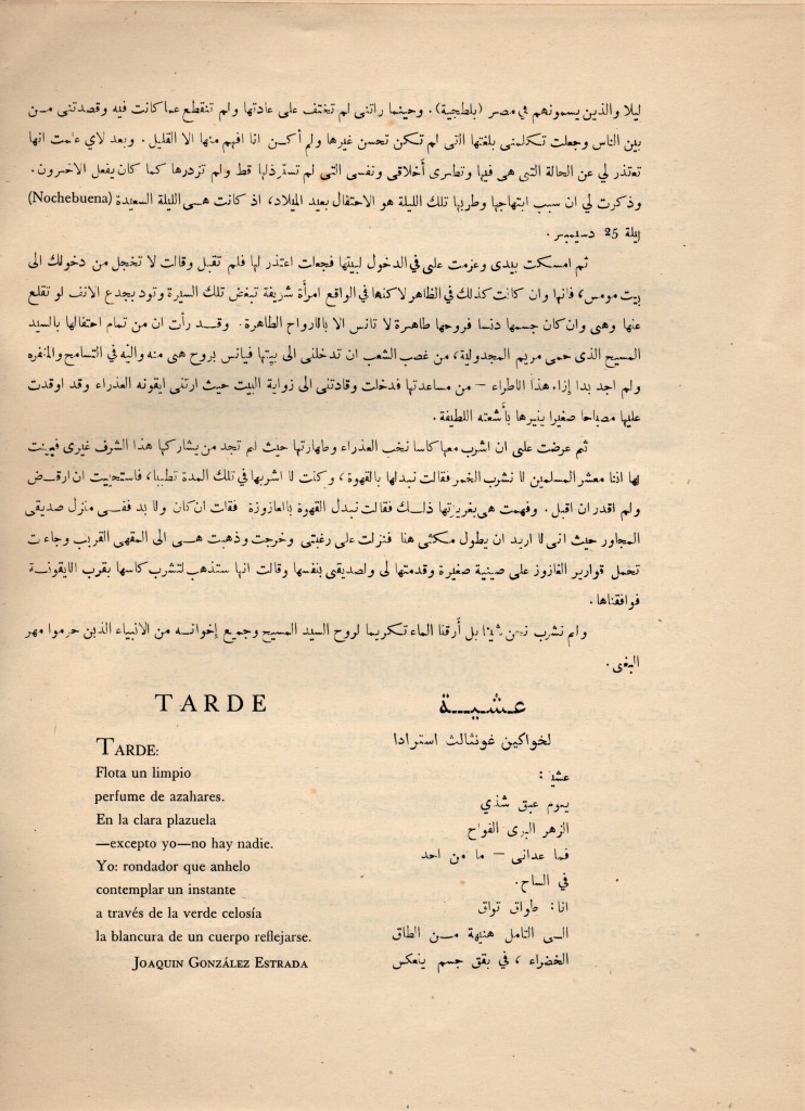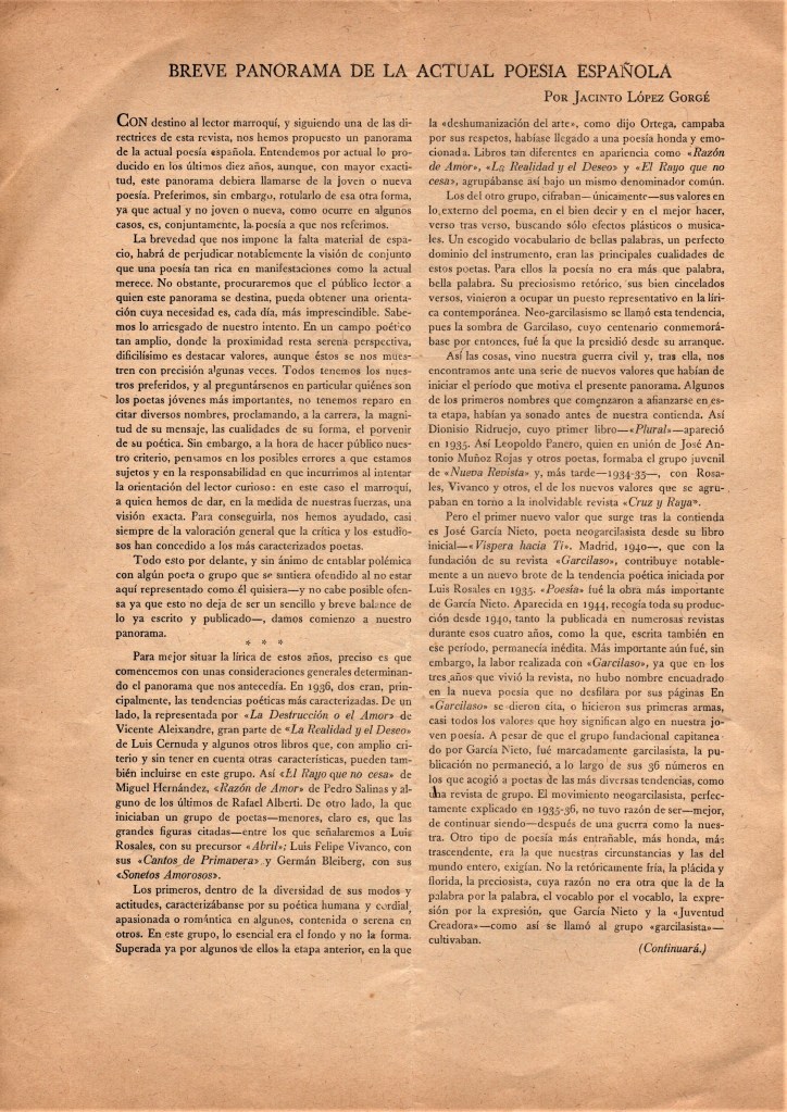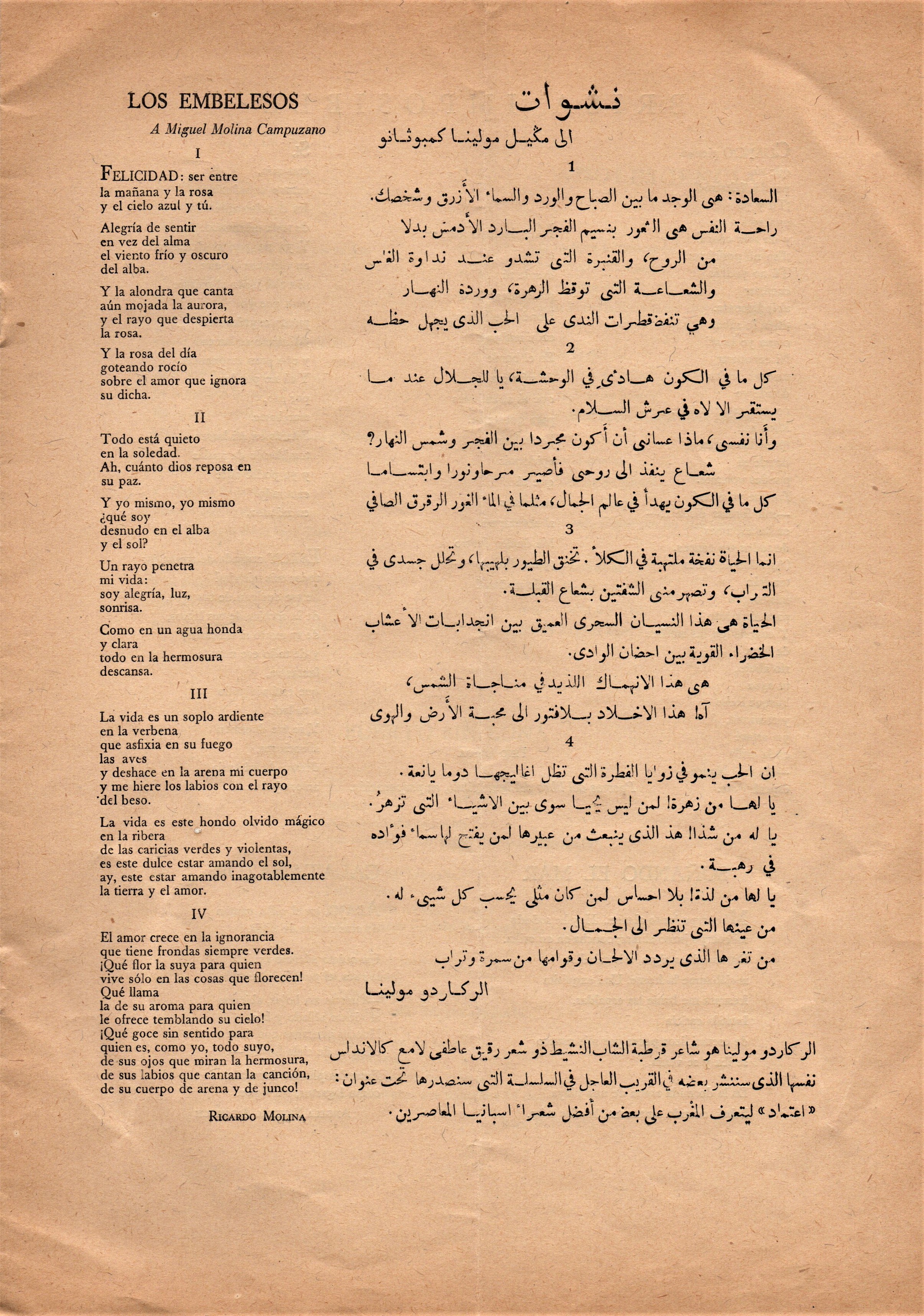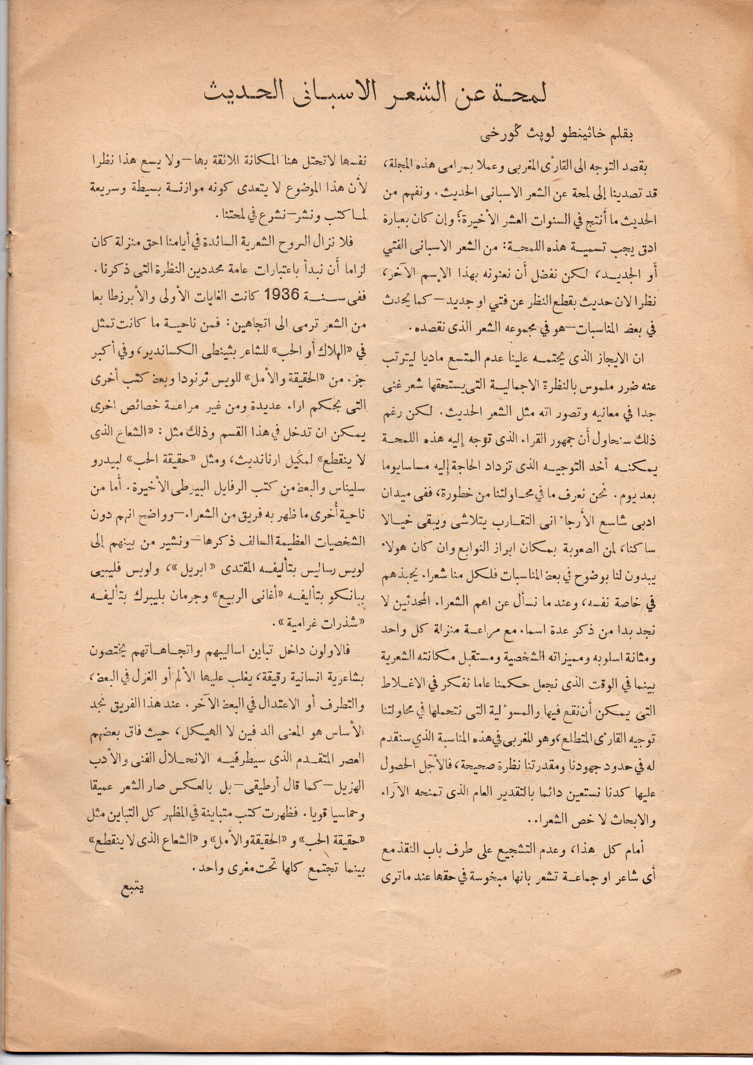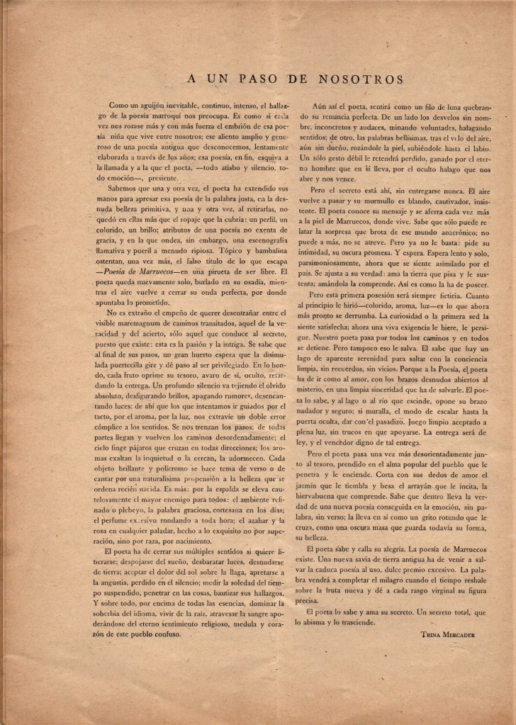 Con anterioridad he compartido con vosotros los números que conservo 11, 14, 17, 19 y 21, de la revista AL-MOTAMID (VERSO Y PROSA). Hoy comparto el número 22 completo. De nuevo, editada en Larache. Este número lo fue en septiembre de 1950, siendo directora la poeta Trina Mercader, secretario de redacción Eladio Sos y traductores de árabe Abdelmalik Nader y el poeta larachense Dris Diuri. La portada de este número es obra de Rosendo Guevara.