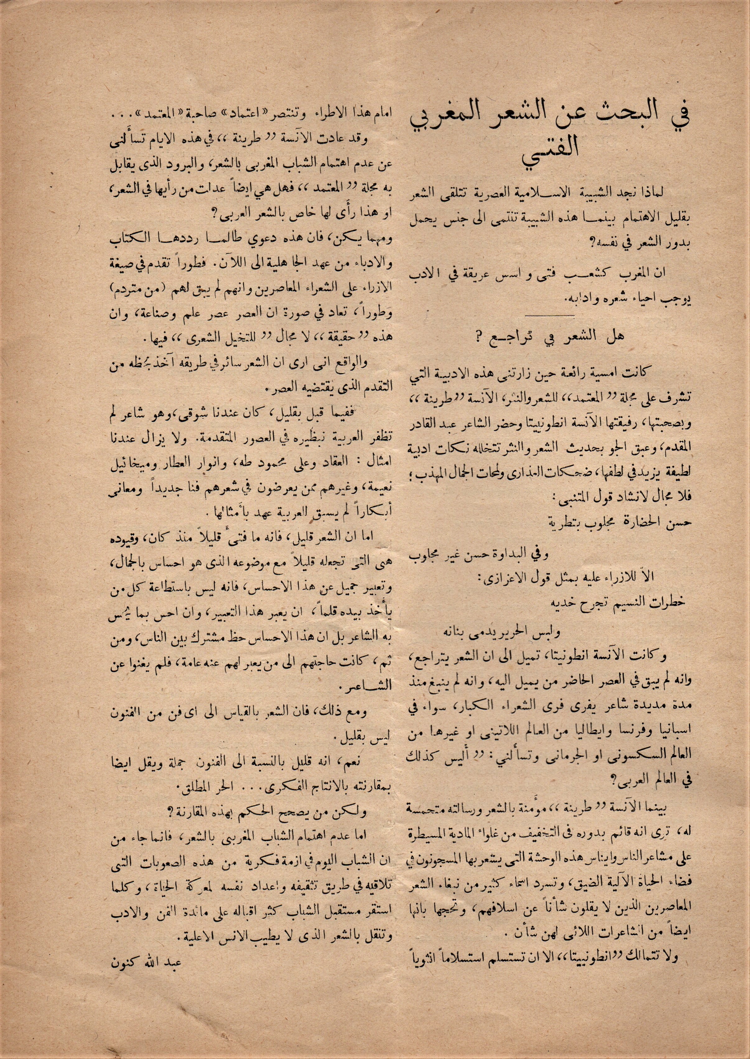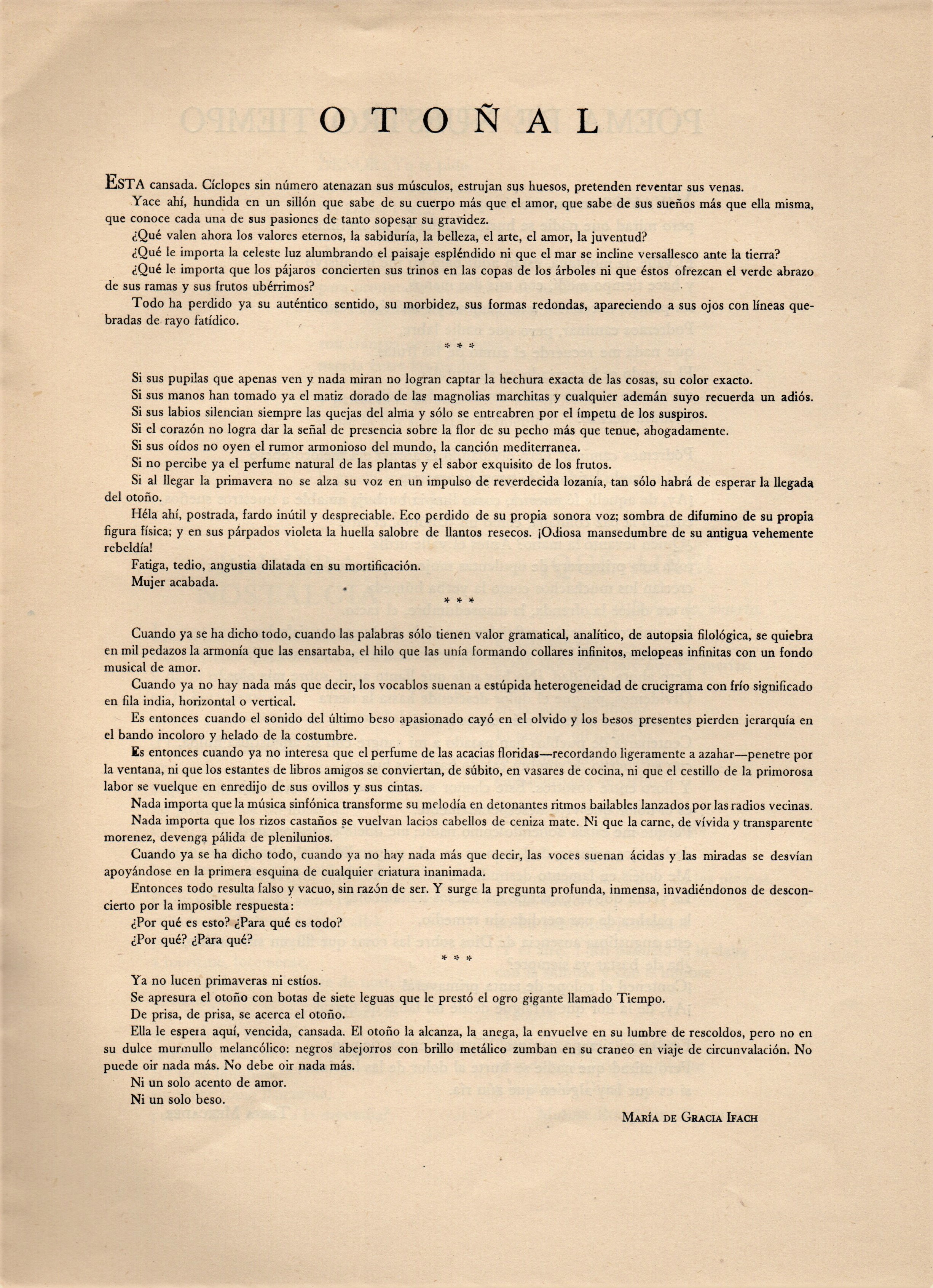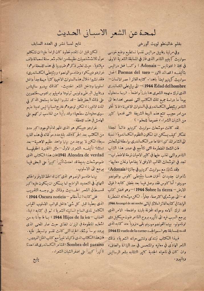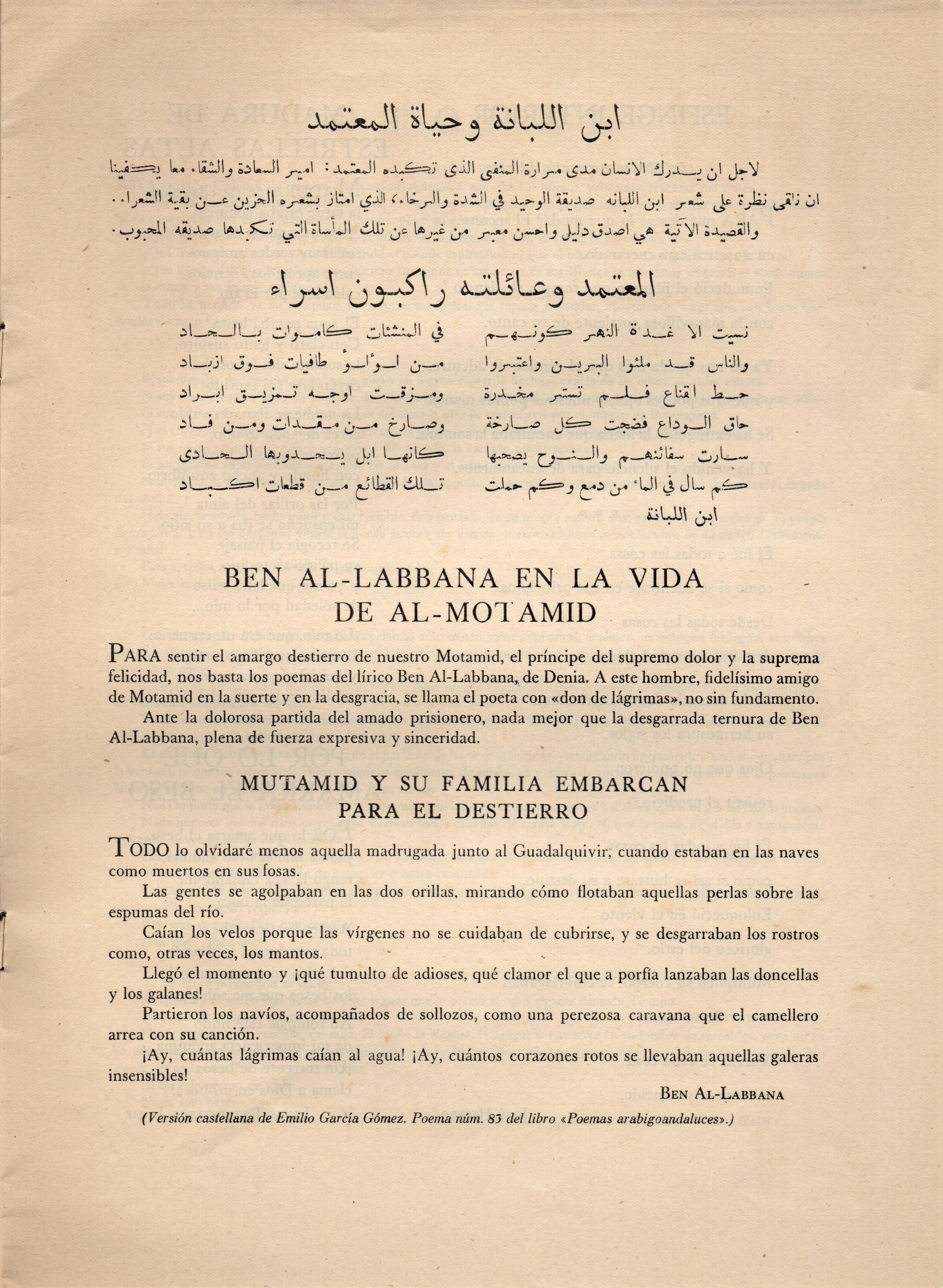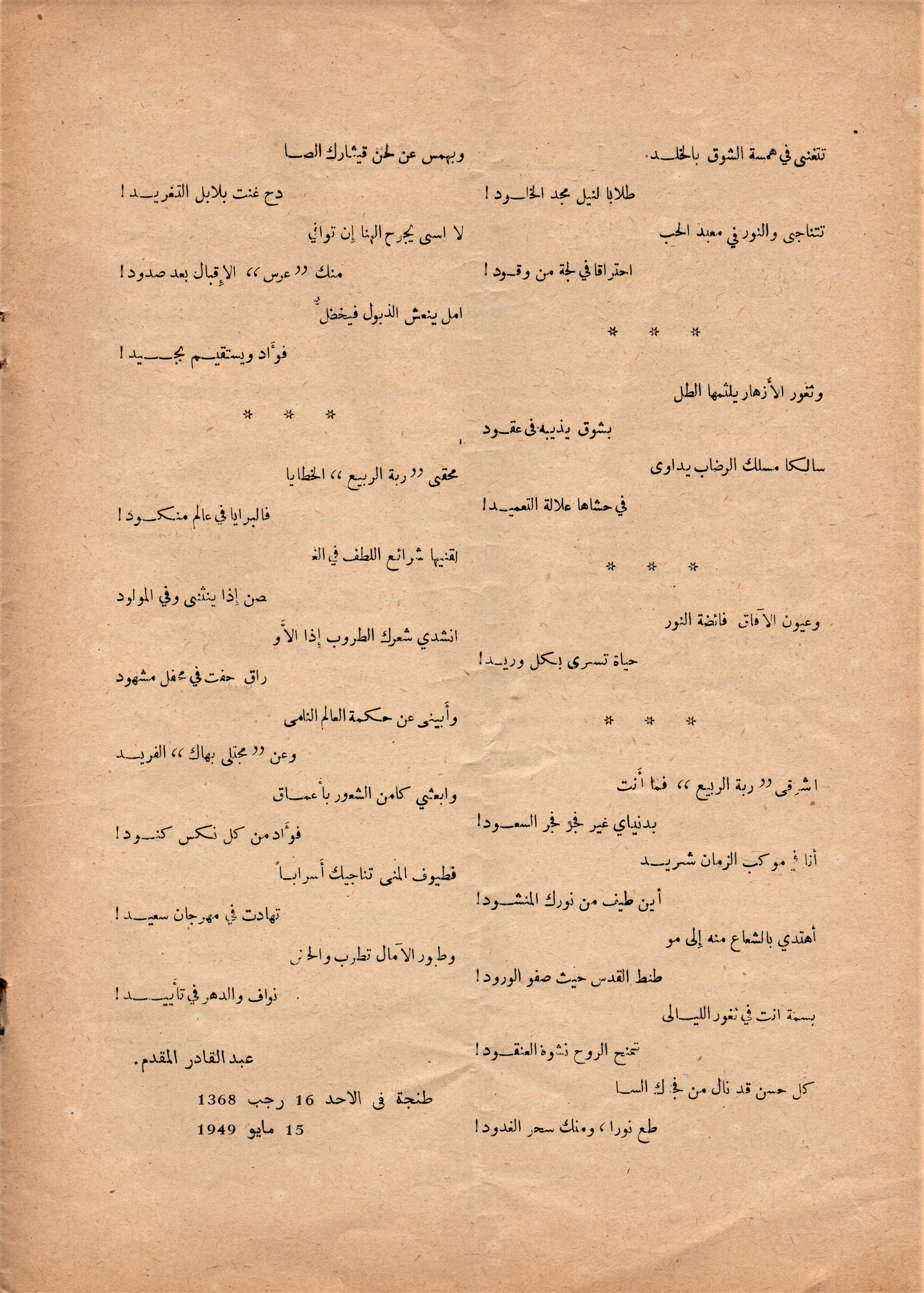 Con anterioridad he compartido con vosotros los números que conservo 11, 14, 17, 19 y 21, de la revista AL-MOTAMID (VERSO Y PROSA). Hoy comparto el número 22 completo. De nuevo, editada en Larache. Este número lo fue en septiembre de 1950, siendo directora la poeta Trina Mercader, secretario de redacción Eladio Sos y traductores de árabe Abdelmalik Nader y el poeta larachense Dris Diuri. La portada de este número es obra de Rosendo Guevara.