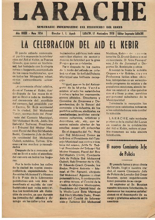 En 1913, el diplomático español Eduardo de León y Ramos describía, en el Boletín Oficial de la Zona de Influencia de España en Marruecos, según me solía contar y comentar el Embajador y conocido arabista Teodoro Ruiz de Cuevas, los detalles de la celebración de Aid el Seguer en Alcazarquivir y en Larache. Narraciones que no variaba en casi nada a como transcurría dicha festividad durante mi juventud, medio siglo después, ni he constatado que haya variado en las dos ciudades del Lukus, en el siguiente medio siglo.