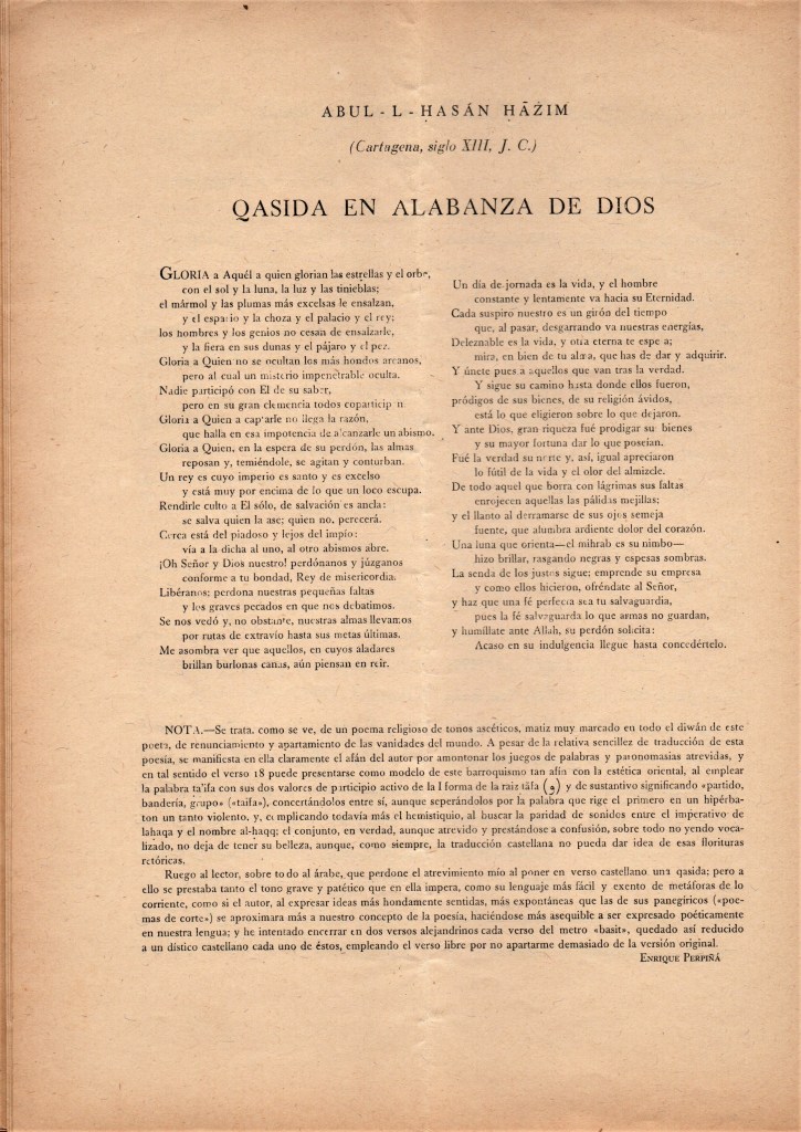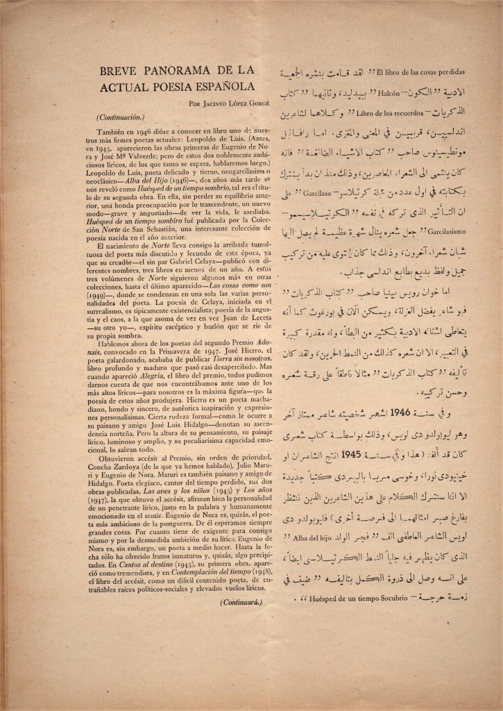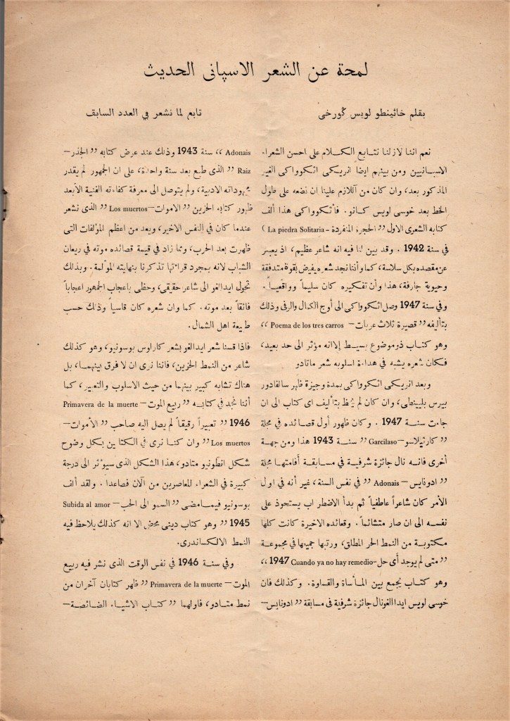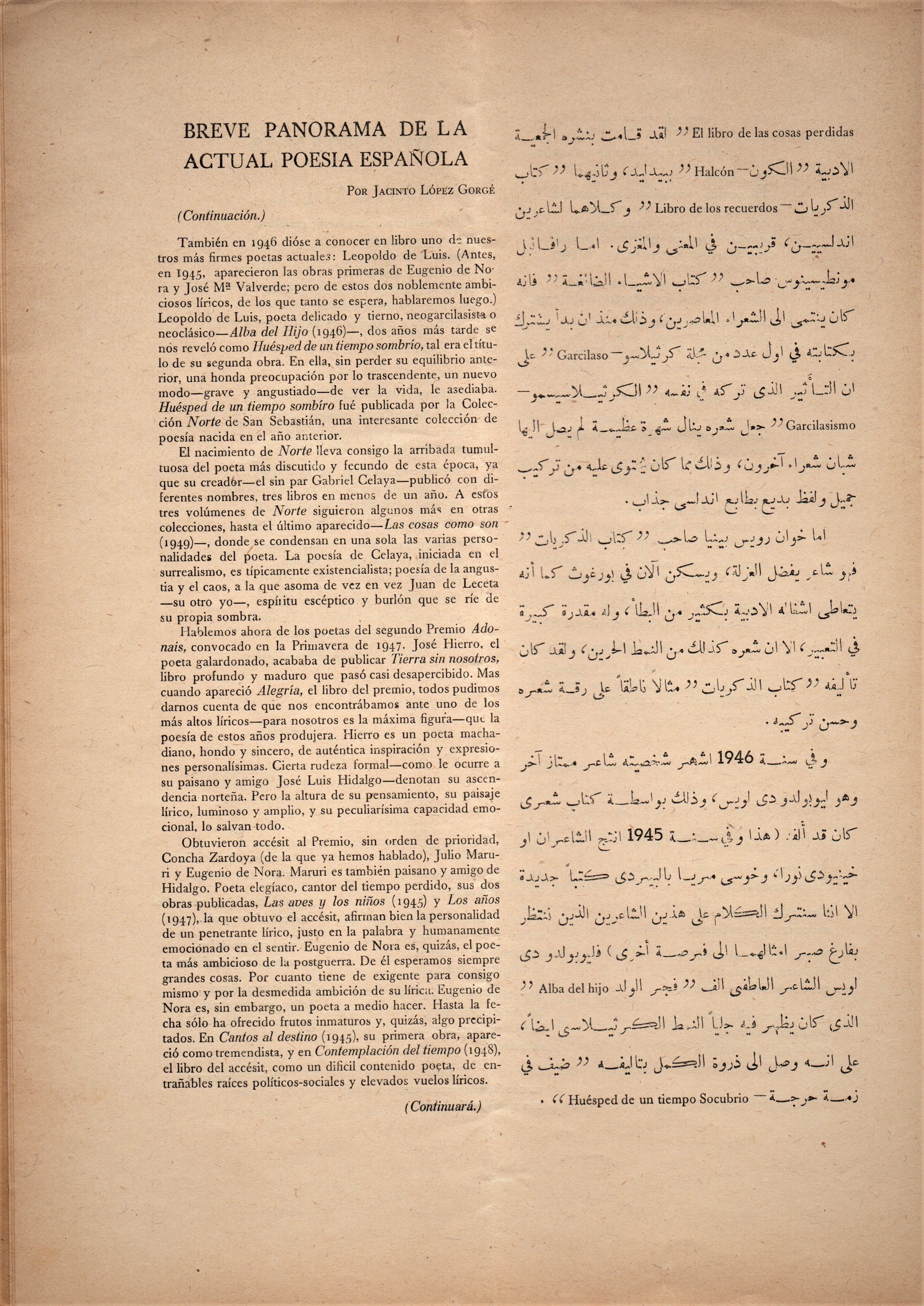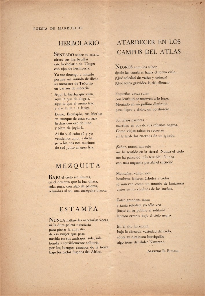 Tras los números 11, 14, 17 y 19, os traigo hoy el número 21 completo de la revista Al-Motamid (Verso y prosa), editado en Larache, en julio de 1950, siendo directora la poeta Trina Mercader, secretario de redacción Eladio Sos y traductores de árabe Abdelmalik Nader y el poeta larachense Dris Diuri.