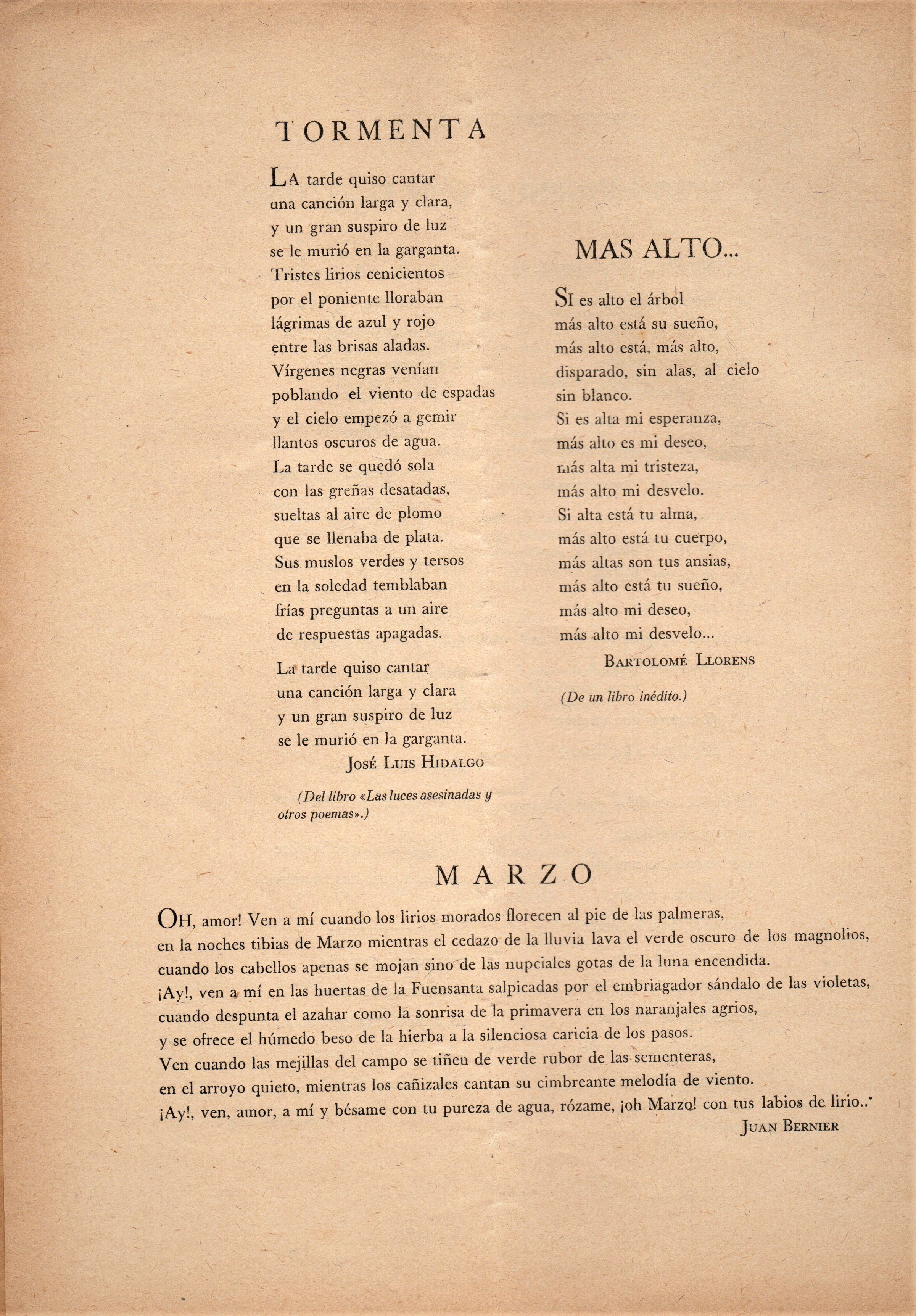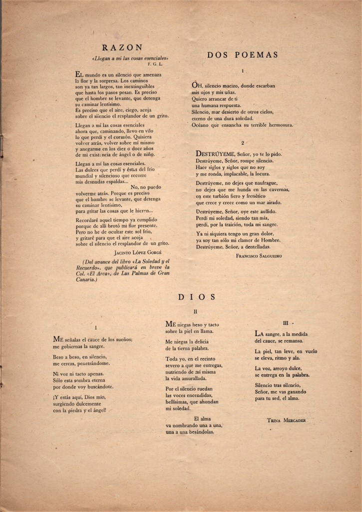 En este número participan autores como José García Nieto, José Luis Hidalgo, Bartolomé Llorens, Juan Bernier, Alfredo R. Bufano, Jacinto López Gorgé, Francisco Salgueiro, Enrique Perpiña, Mahmud Abu Rakiba, Carmen Martín de la Escalera, Susana March, Isidro Miranda, Alfonso Pinto, Pío Gómez Nisa, Eladio Sos, Ventura Doreste y la propia Trina.