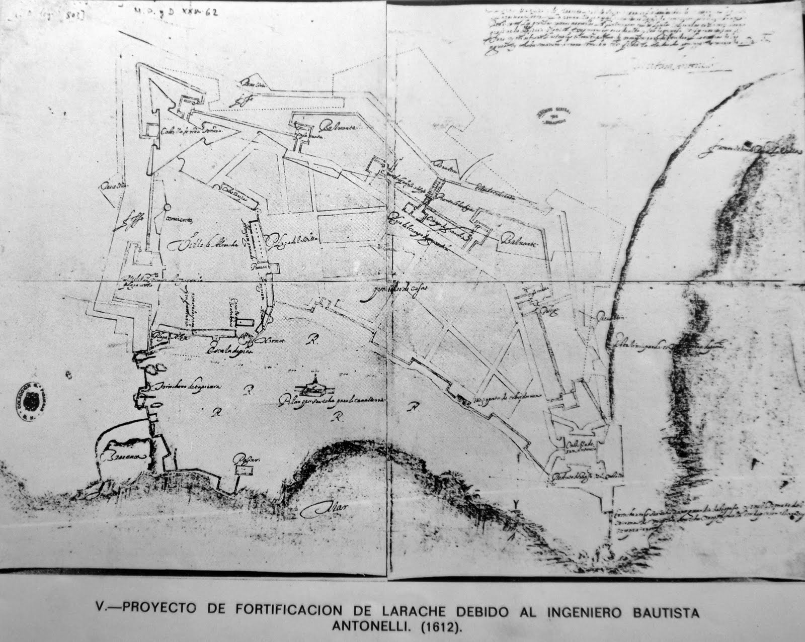 <…ya entonces Larache contaba con un significativo aporte español: los moriscos que, habiendo sido expulsados muy poco antes de la Península, habían ido a parar allí. Estimulados por ese sustrato que de mayor o menor grado les era favorable y por la debilidad del sultán, los ocupantes españoles completaron las defensas de la ciudad definiendo un amplio perímetro que englobaba la vieja kasbah y sus arrabales y unía las dos fortalezas saadíes, fortificación que se llevó a cabo según proyecto de otro ingeniero italiano, Bautista Antonelli.