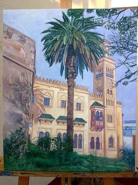 En Diciembre del pasado año, dediqué un artículo a mi amigo HAKIM EL HARRAK, pintor nacido en Larache. Ahora, Hakim me ha enviado sus nuevos cuadros que hablan de nuestra ciudad, que la retratan. Su pintura es tan sencilla como él, sin artificios, directa, plasmando lo que siente en cada momento. La Comandancia, ahora Casa de la Cultura, pero que Hakim sigue titulando como todos conocen en Larache al inmueble, rodeado de un verde vivo, trazada con esmero, como si con su pincel reparara los años y la vejez del edificio.