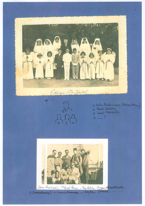 De las fotos que me dio Paco Selva, hay varias con grupos, como las dos siguientes: la de arriba pertenece al Colegio Santa Isabel con su directora Doña Patrocinio, el propio Paco Selva de uniforme oscuro y Luis Morcillo con el traje beige. Los demás no los recuerda. Y la segunda, un grupo de buenos amigos: Juan Andrade, Miguel Ponce, Paco Selva, Cuqui Andrade, Zamorana, Lucio Dámaso, Rafa Gómez y Aurelio.