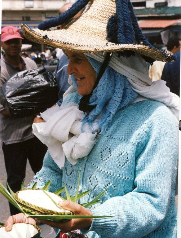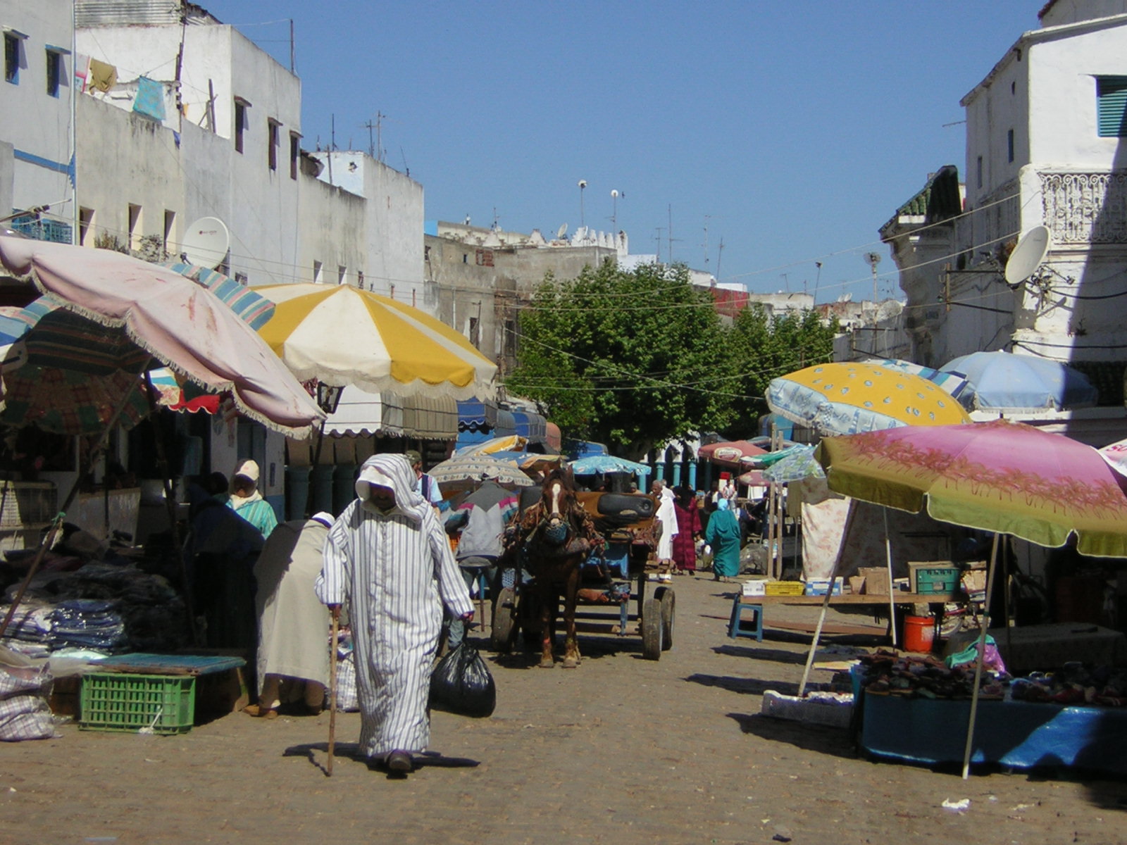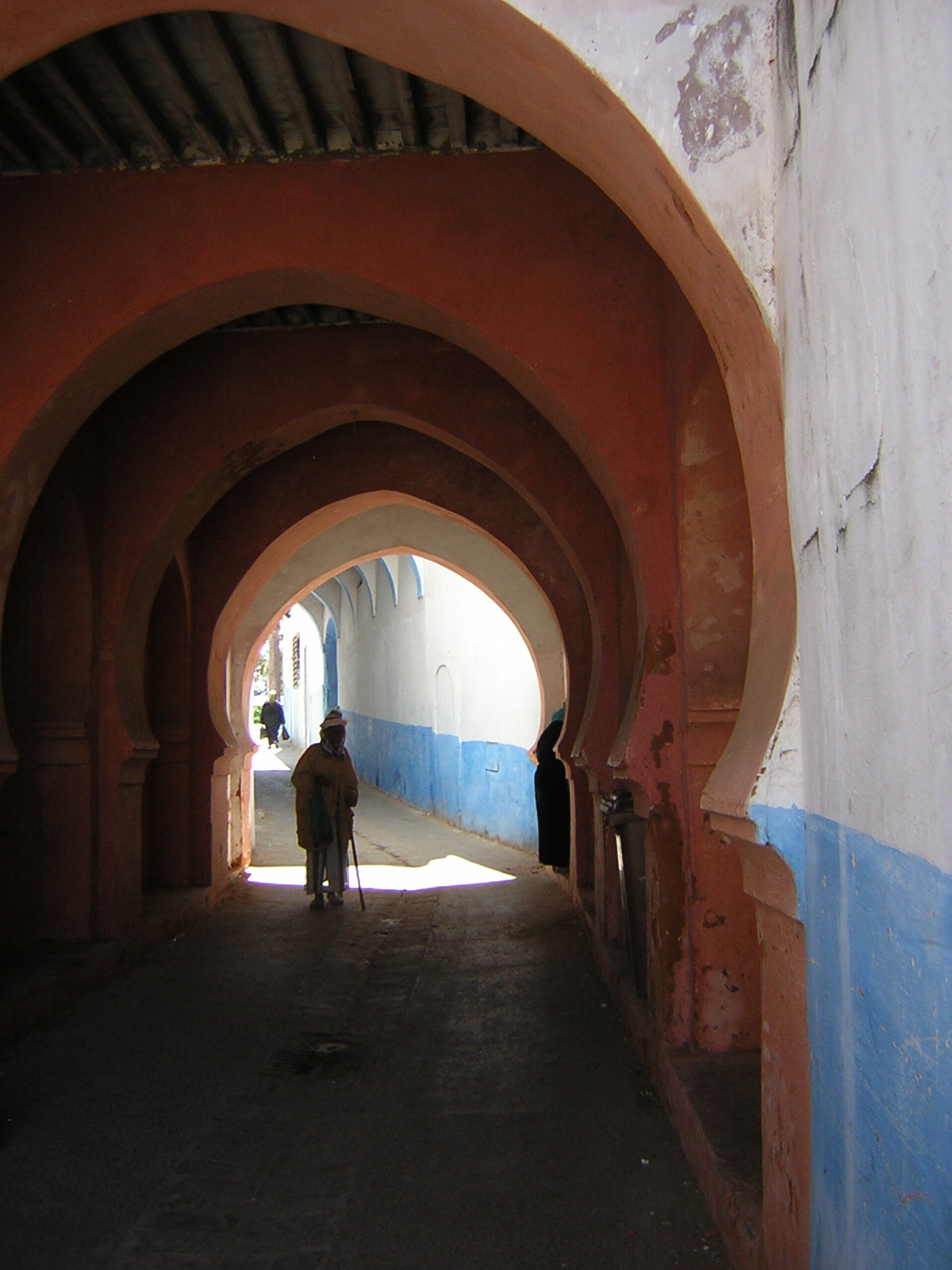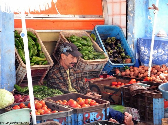 La paleta se multiplica en los puestos de la Plaza, especias, frutas, pescado o carne, son el rojizo azafrán, los melones amarillos, la plata de las sardinas o la roja sangre del cordero; en el Zoco Chico refulgen los escaparates de los joyeros, tientan los tejidos verdes, turquesas, negros y cobaltos de los vendedores de caftanes. Pasa el afilador y el aguador, y se oyen los colores de sus voces, confundidos ahora con las canciones que suenan en antiguas radios y en viejos reproductores. Se asoma el susi con su bata añil, se detiene una mujer con chilaba blanca, y otra entra en el almacén ataviada de verde y con el itam negro cubriéndole el rostro. Cerca, campesinas sentadas en el suelo con sombreros de paja decorados con borlas multicolores. Hay carros de verduras, de naranjas, de brevas, de uvas. Y de pronto todo se detiene por un segundo cuando la voz del almuédano llama a la oración desde la mezquita Anwar, la voz escapando de los altavoces del minarete en un eco ancestral. Pero también hay en Larache otros ecos de otros rezos en sinagogas y en iglesias que resuenan en la memoria.