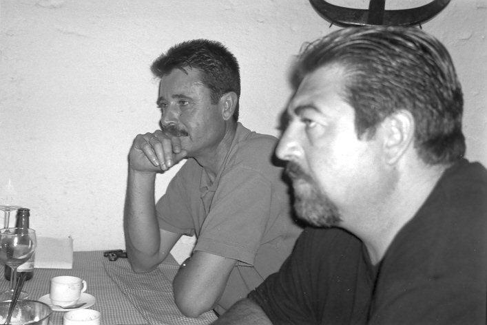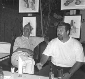 El dar saltos en el tiempo sólo tiene como objetivo despertar vuestro interés, evitar la monotonia de una serie de fotos de los mismos años, y busco con ello interrelacionar a los larachenses de todas las generaciones. Después de llegar al año 2004 vuelvo a los cincuenta, por ejemplo. En la imagen que sigue, en otro bar de Larache, Juan Miguel Columé y Eduardo Rojas con otros dos amigos.