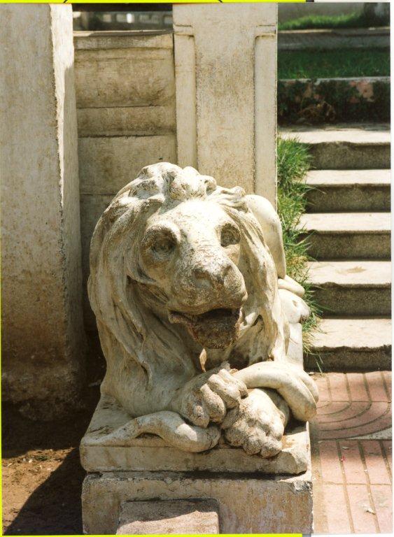 Y ese león, uno de los que franquean la entrada al Jardín de las Hespérides, una de las dos fieras a las que todos nos montamos en nuestra niñez (y ahora para recoerdarlo). Parece mentira que unas esculturas formen parte de nuestra memoria, que hayan cobrado vida y nos parezca que, de alguna manera, respirasen con cierta resignación cuando nos subíamos a sus fríos lomos. Ahora pasamos a su lado, los miramos con ternura, y nos parecen diminutos, de fieras han pasado a mansos felinos, y el hermoso jardín también queda en nuestra memoria, con chita metida en su jaula, y con los cañones aún en pie, y con las parejas de novios paseando y abrazándose al anochecer… Y ya veo que Javi tampoco pudo evitar echarle una foto, para guardárselos, porque los leones también son «suyos», y nuestros.