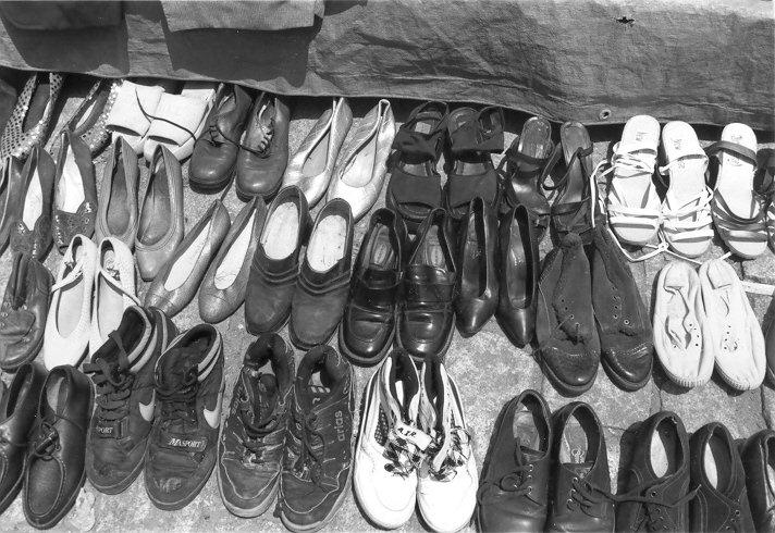Esos zapatos, que vivieron la vida de otros, aguardando la llegada de quien de nuevo los hará caminar, pisar la tierra, sentir el latido de la impaciencia con una carrera, bien el taconeo de la espera de quizá una ilusión pasajera. Vemos puestos de zapatos viejos en el Zoco Chico como algo natural que, sin embargo, casi se ha desterrado de este otro lado del estrecho, pero que, para otra gente, sin recursos, siguen siendo casi un pequeño tesoro. Mientras, Miguel Angel y Fernando Pérez conversan animadamente en la Casa de España de Larache, bajo la atenta mirada de Javier.
