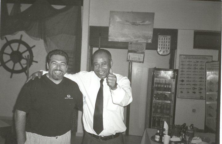 Y en esta barra de bar, también otros dos de los grandes amigos de mi padre (Antonio Barce), compañeros de UNIBAN, y que aparecen en el centro de la estampa: Juanito Vargas y Manolo Alvarez.  Corría el año 1957. Manolo, que siempre defendía con vehemencia a su Valencia CF, de eso sí me acuerdo, y de su sonrisa.  Mi niñez siempre asocia a  mis padres con los Alvarez, como si hubiésemos formado parte de una misma familia. Antonio Roda Jorge me indica que les acompañan en la fotografía sus tíos Nicolás y Antolín Jorge Mateos.