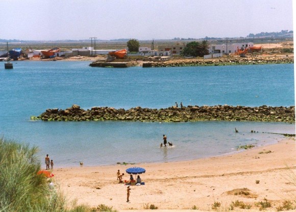 Hay que decir que había otros lugares al aire libre que invitaban a tomarse algo… Por ejemplo, en los chiringuitos de la playa. En la siguiente fotografía Paco Rodríguez, en el centro, pasándoselo bien en el chiringuito de la Otra Banda:
