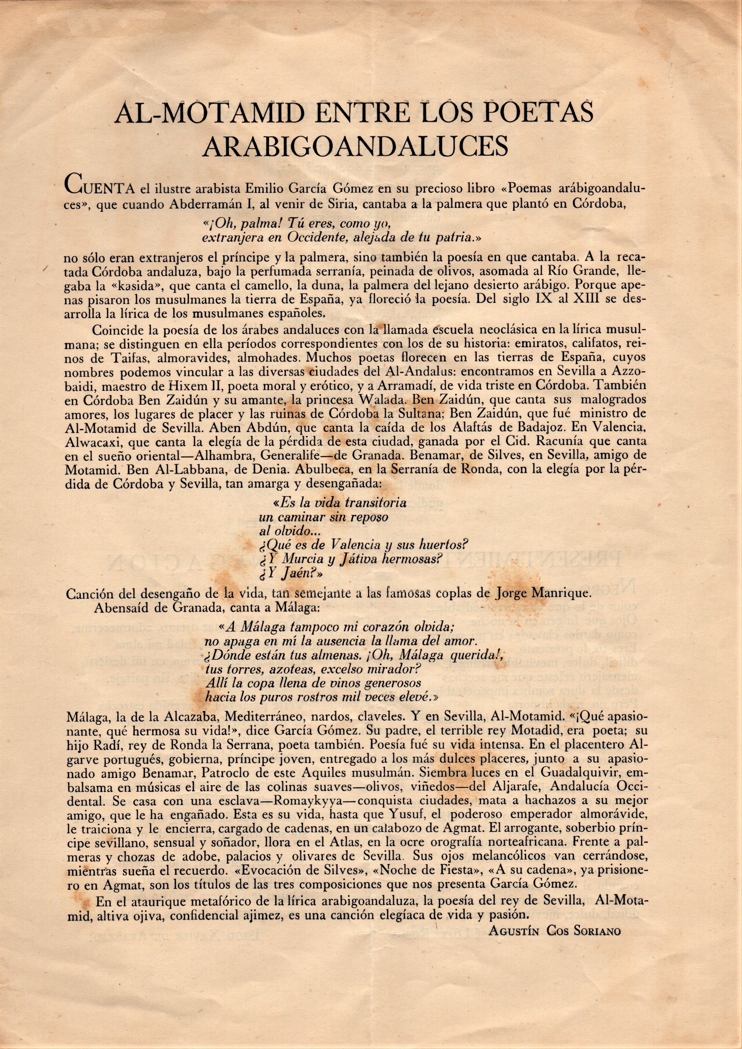 AL MOTAMID ENTRE LOS POETAS ARABIGO ANDALUCES por Agustín Cos Soriano