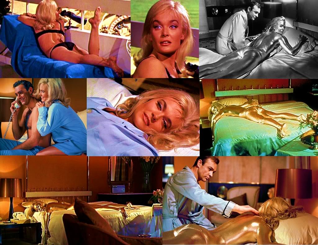 Ya he dicho que crecimos con James Bond. Y, junto a este personaje de Ian Fleming, están las “chicas Bond”. Entre todas ellas, hay una efímera (por el corto tiempo que está en pantalla, en concreto en “Goldfinger” (1964)), pero que a los cinéfilos nos marcó de alguna forma: Shirley Eaton.  Era preciosa. Aparece al comienzo del film “Goldfinger” pero, a las primeras de cambio, la asesinan de la forma más cruel pero también original –cinematográficamente hablando-: bañándola en oro…