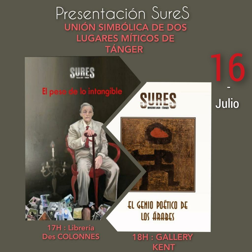 A las 17 horas (en punto) del viernes 16 de julio presentaremos en la mítica librería el último número de SureS: El peso de lo intangible donde intelectuales y escritores reflexionan y fabulan sobre la relación de los artistas con lo invisible. En este número -también ya mítico- se encuentran textos de Tahar Ben Jelloun, Marta Cerezales Laforet, Mohamed El Morabet, Sergio Barce, Miguel Moreta-Lara, Abdelkader Chaui, Philipe Bologne, Ali Tajiti y los poetas del diván de los cuentos de SureS. Luego para unir la querida librería con el vigor de la mítica Galería Kent presentaremos El genio poético de los árabes (que tuvimos que postergar a causa de la pandemia). El genio poético de los árabes que tuvo una gran repercusión y recepción contiene obras de pintores marroquíes que invocan a los yenún y de poetas también marroquíes que han sido para este numero traducidos al español. Los esperamos en estos cruces y encuentros míticos.