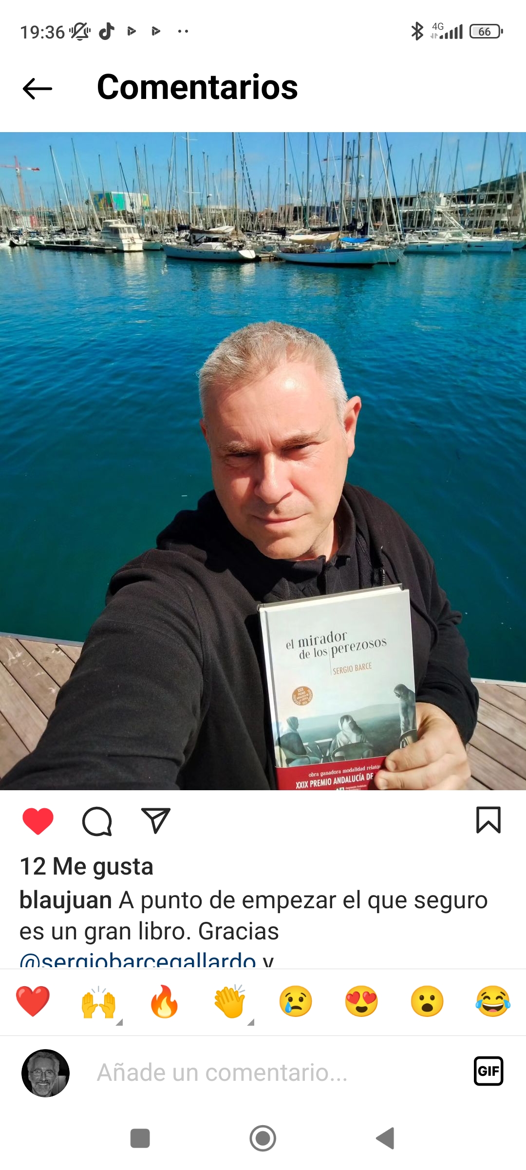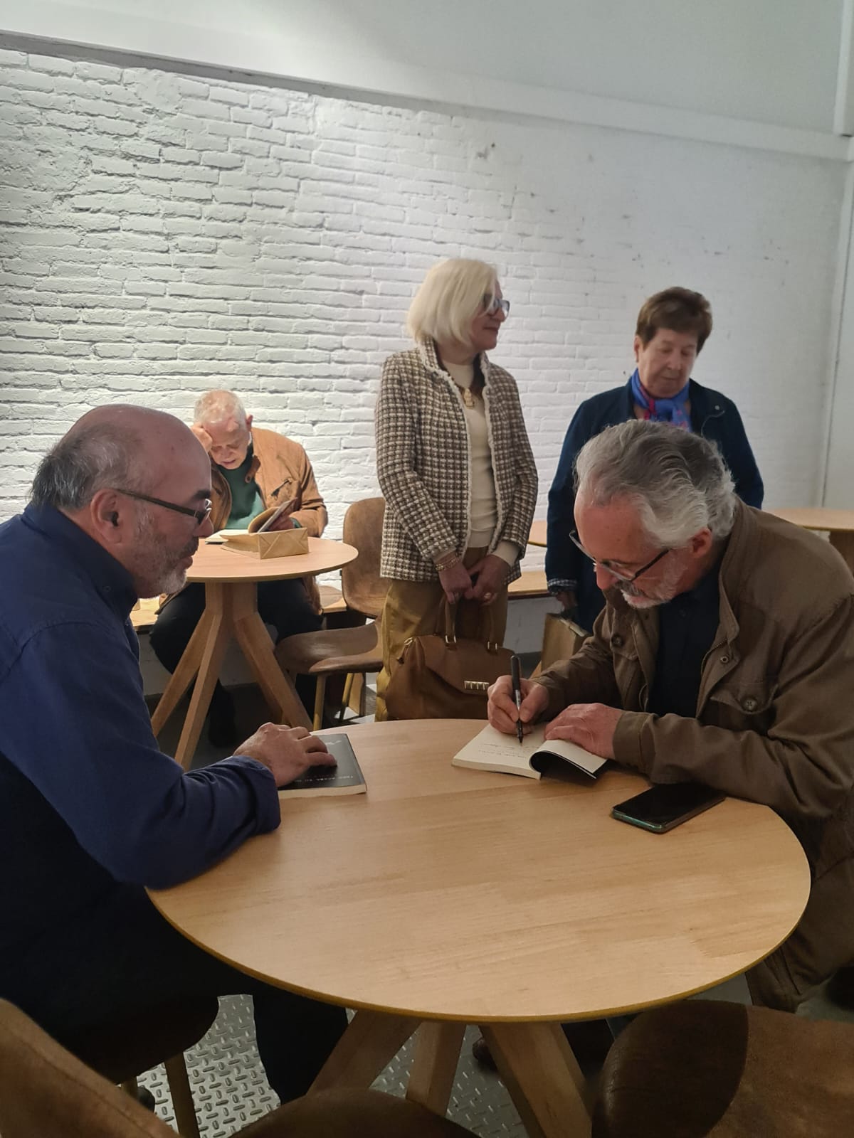 Y yo, rodeado de amigos, lo disfruté aún más. Aunque me fallaron Naima, Laila, María Josefa y Joana, que son mis fieles, me acompañaron, entre otros, mis queridos Juan Pablo Caja, Maribel Fernández Gallardo, Cristóbal Ramírez y Ana, Juan Antonio Alguacil, José María Fernández Gallardo y Mercedes Castañé; Francisco Antúnez y Hortensia; Abdelmalek Rghioui, y la directora de cine y ya amiga entrañable Isabel Fernández; mi admirado Juan Gabriel López Guix, que vino acompañado de su padre, un hombre genial y divertido; y también José Miguel Feria, siempre a mi lado; y Alberto Fuentes, Isaac, Marcos García y Blaujuan, entre otros. Es decir, mucho larachense, tangerino, alcazareño y barcelonés… Por cierto, el pintor Blaujuan se llevó un ejemplar de «El mirador de los perezosos» y luego se hizo un selfi que compartió en instagram.