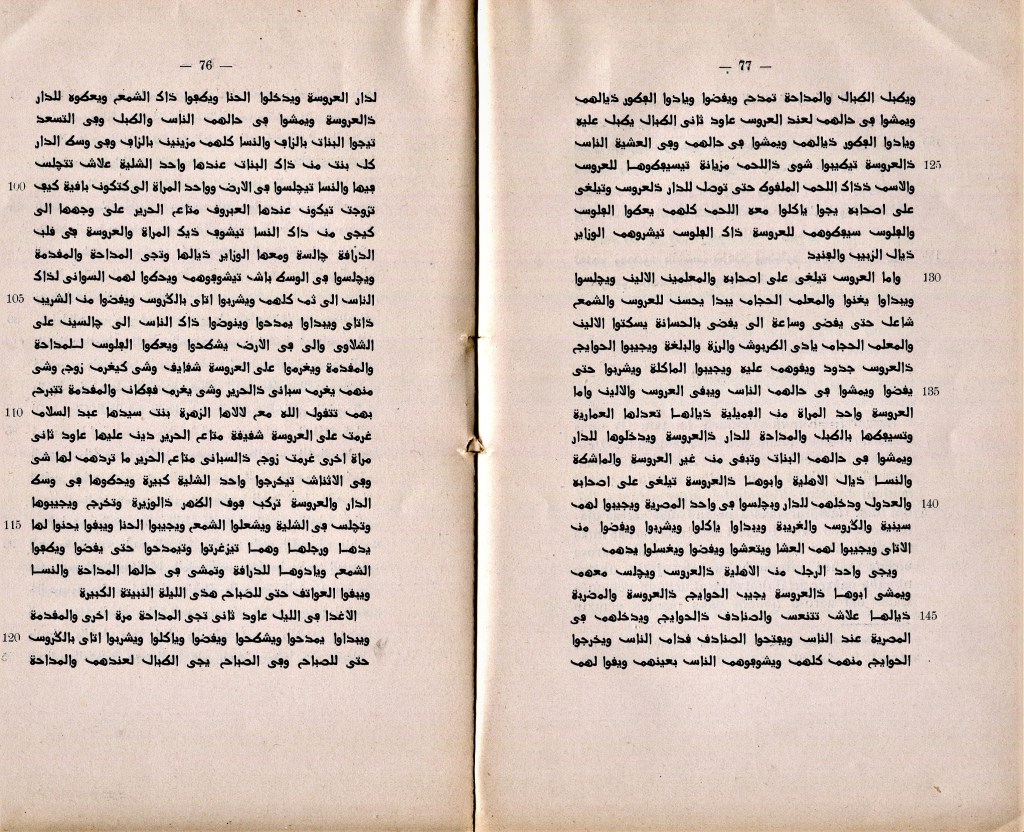Volviendo al libro de Alarcón, los textos que aparecen en la obra, un total de once, se refieren a costumbres y a cuentos populares de Larache. Los once relatos se encuentran escritos en grafía árabe y en transcripción. Al final del libro se recoge la traducción de éstos y un pequeño vocabulario bastante escueto…”