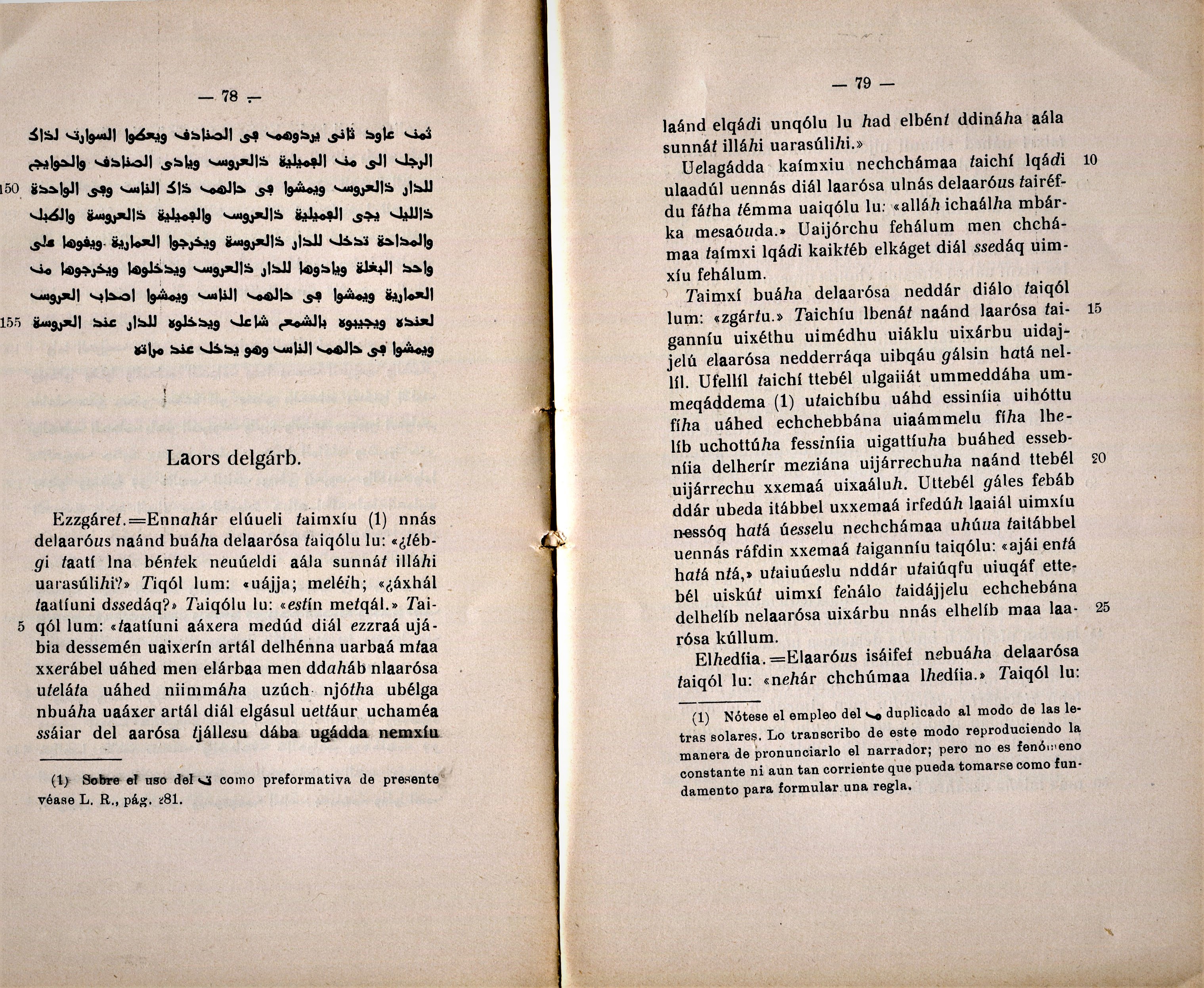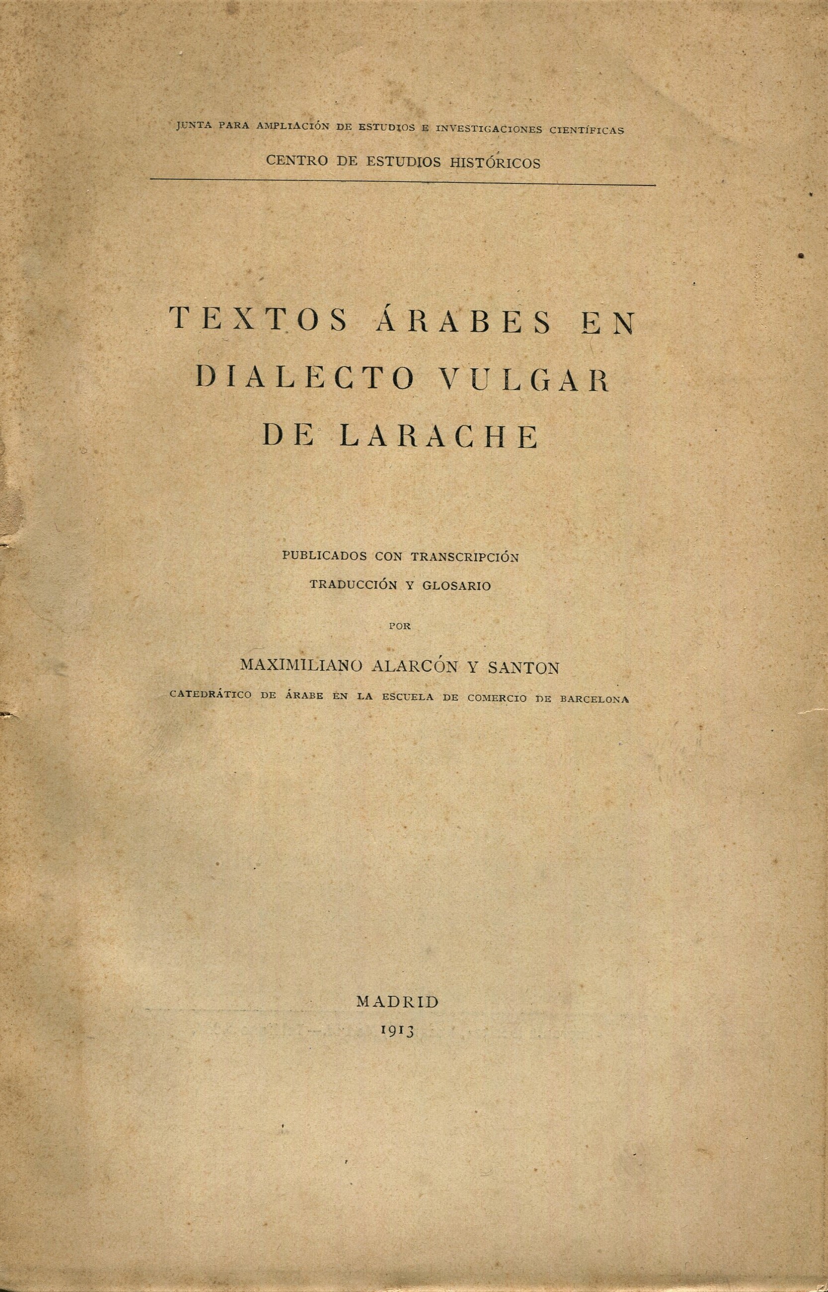 Jean Cantineau decía en 1955 que hasta el momento se habían publicado muchos textos en dialecto y pocos estudios gramaticales y glosarios. Es el caso del libro publicado en 1913 por Maximiliano Alarcón y Santón <Textos árabes en dialecto vulgar de Larache>. Estos textos fueron recogidos por el autor en Larache, entre el 27 de julio y el 13 de octubre de 1910…