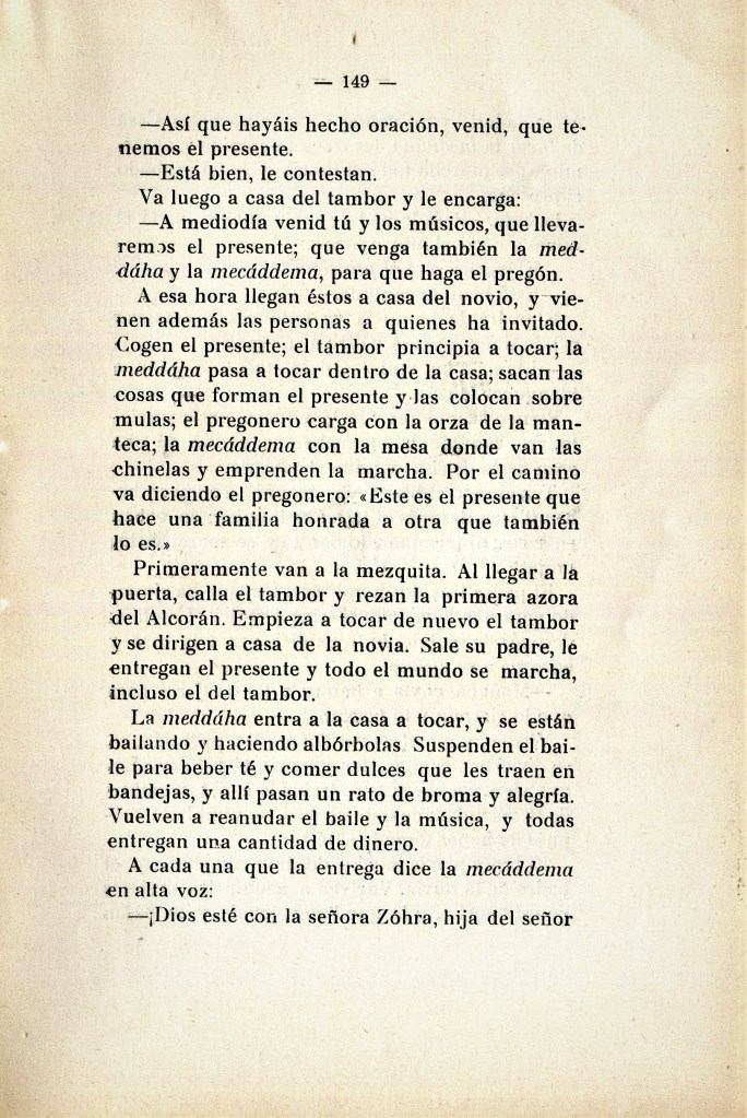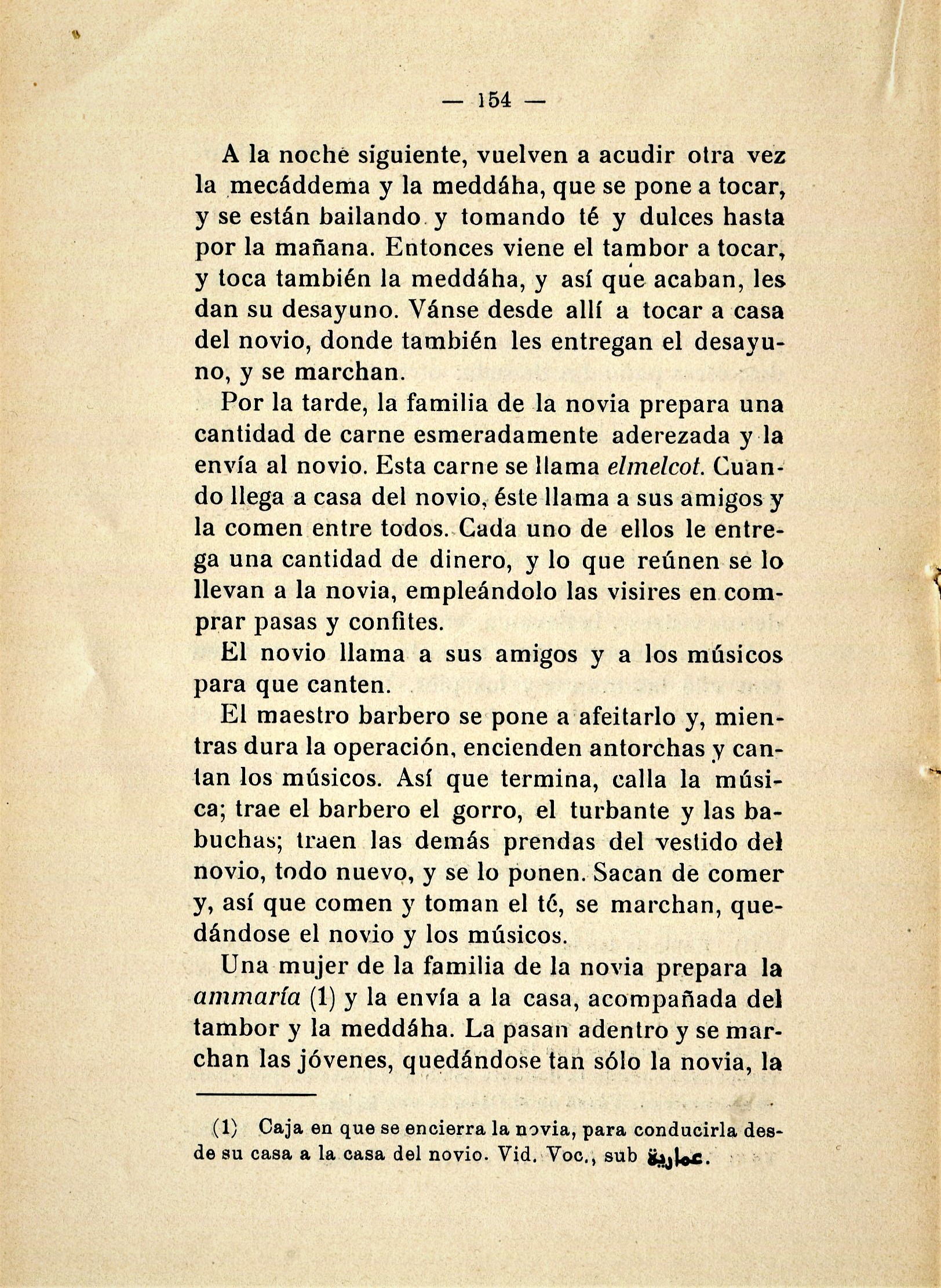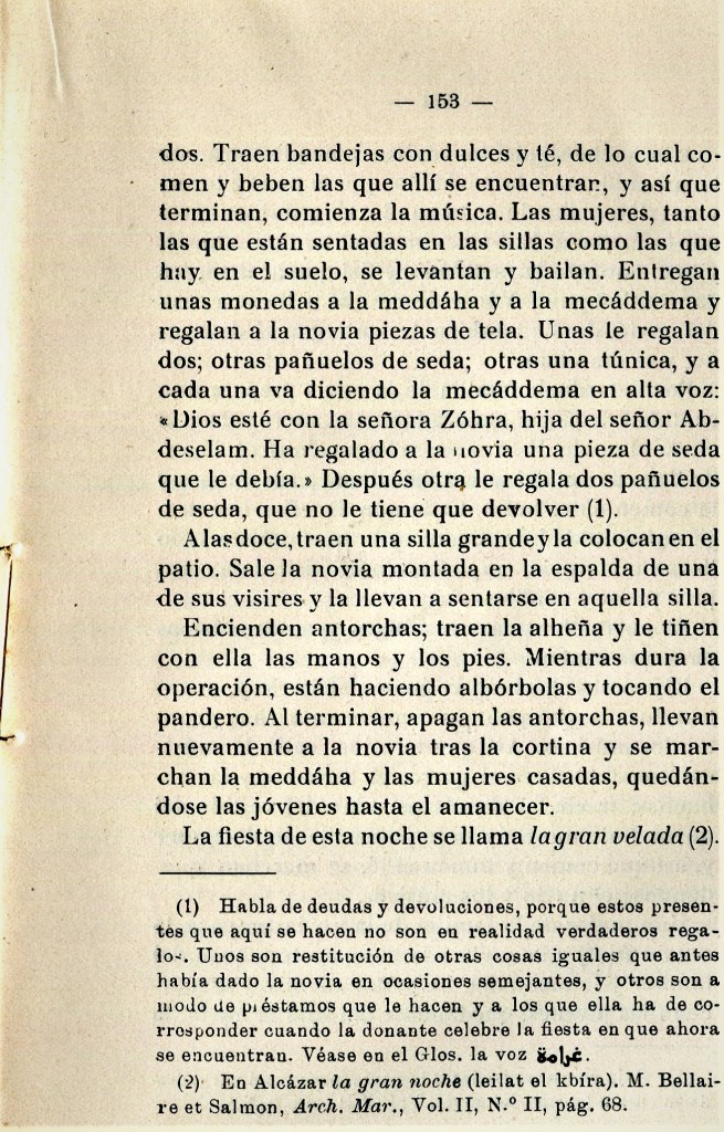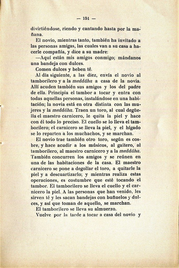 Maximiliano Alarcón y Santón, catedrático de árabe de la Escuela de Comercio de Barcelona, publicó en Madrid, para el Centro de Estudios Históricos, el libro Textos árabes en dialecto vulgar de Larache, donde recopila una serie de cuentos y narraciones que le transmitieron oralmente la gente de Larache durante 1910 y que reproduce en su idioma árabe original, junto a su transcripción fonética y su debida traducción al español. Este libro se publicó en 1913, y forma parte de mi biblioteca larachense privada. De entre los textos que se recogen en el volumen, os escaneo a continuación la traducción del titulado El matrimonio en Marruecos, junto al mismo texto en árabe vulgar de Larache y su transcripción fonética, tal y como hizo Maximiliano Alarcón.