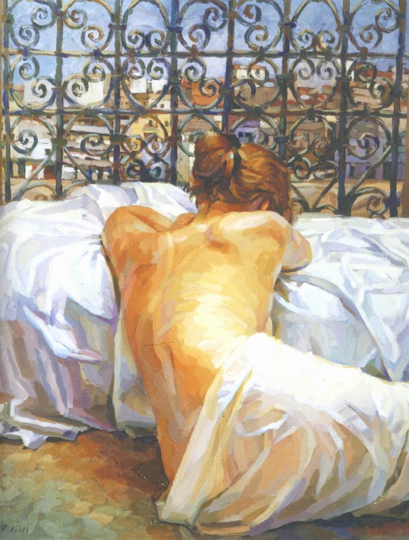 Él la observa en silencio desde la puerta entornada, conteniendo la respiración para que ella no le descubra. Anhela que la sábana se deslice del todo y deje al descubierto el resto de su espalda, pero ella está ensimismada y no se mueve en absoluto, atrapada por el mundo exterior, igual que una cautiva encarcelada en una torre inexpugnable.