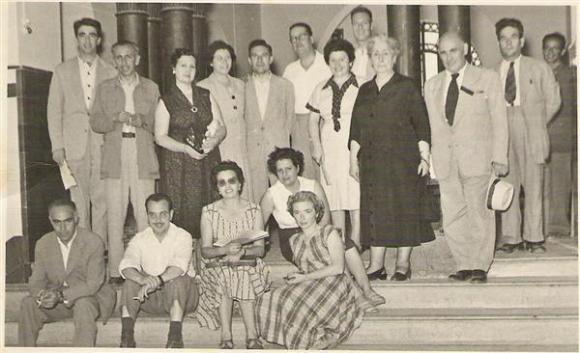-En la primera fila y todos sentados, conforme se mira la fotograqfía y de izquierda a derecha: Domingo (no se ha podido conseguir su apellido), César MONTORO, Estrella ABECASIS FERERES (mujer y prima hermana de Aarón MEDINA FERERES), es la señora rubia y con traje de cuadros y sentada tras la anterior Celia BENCHIMOL, con blusa blanca y falda negra.