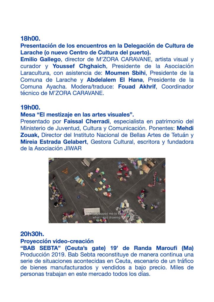 M´ZORA CARAVANE, que cuenta en su director-curador, el escultor larachense Emilio Gallego, a un infatigable impulsor de este movimiento, es difícil de encuadrar. Es un encuentro anual multicultural y multidisciplinar, que abarca propuestas plásticas, visuales, interpretativas o manuales, en el que se confrontan y se comparten experiencias y propuestas que van más allá de lo convencional, a veces vanguardistas y transgresoras, siempre experimentales. Artistas transfronterizos que desdibujan los límites divisorios entre países y culturas. Un flujo y reflujo de ideas que se plasman en la rica programación de este año: video-creación, fotografía, escultura, pintura, performances, música, danza…