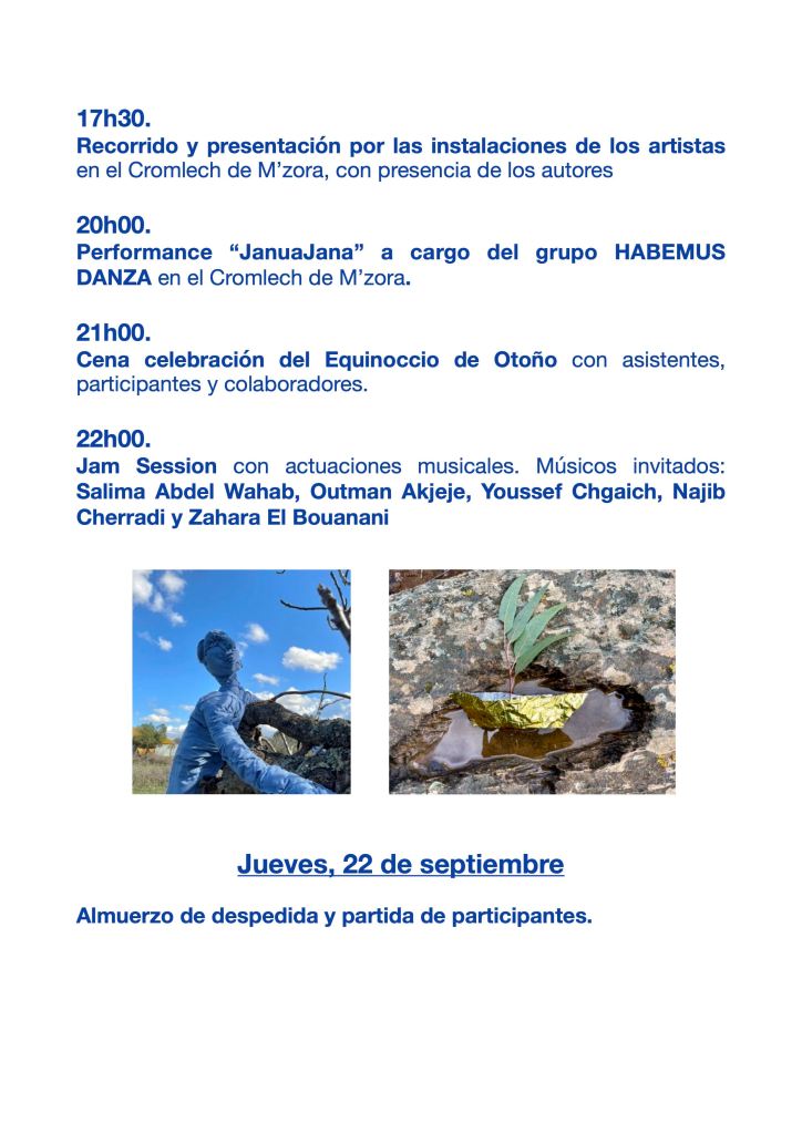 M´ZORA CARAVANE, al ir ampliando sus expectativas y dimensiones, ya no solo es un encuentro de unos artistas en el Cromlech de M´Zora durante el equinoccio de otoño, que sigue celebrándose, por supuesto; ahora, en esta XIV edición, desde ese lugar germinal, se ha proyectado hacia otros grupos y ámbitos: trabajos de reciclaje, artísticos, manuales o de marionetas con los escolares del Colegio Público de M´Zora, talleres en el nuevo Centro de la Delegación de Cultura de Larache en el puerto, las actividades y exposiciones en el flamante Centro del Instituto Cervantes de Larache, que ya acogió el pasado año la primera colaboración, y las que se realizan en el propio Cromlech.